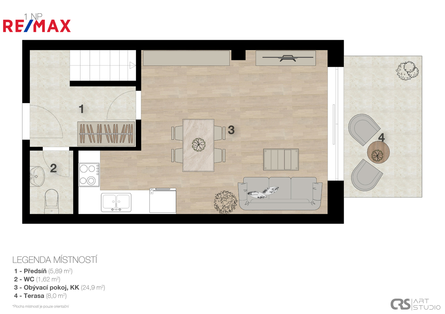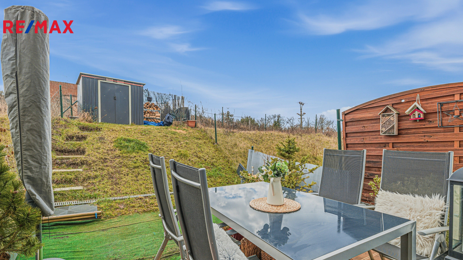 V přízemí se nachází předsíň se schodištěm, samostatná toaleta a světlý obývací pokoj s kuchyňským koutem a přímým vstupem na venkovní terasu o velikosti 8 m², na kterou navazuje oplocená zahrada poskytující dostatek soukromí i prostoru pro relaxaci. V patře je chodba se schodištěm, dva samostatné pokoje, koupelna s vanou a toaletou a technická místnost s bojlerem.