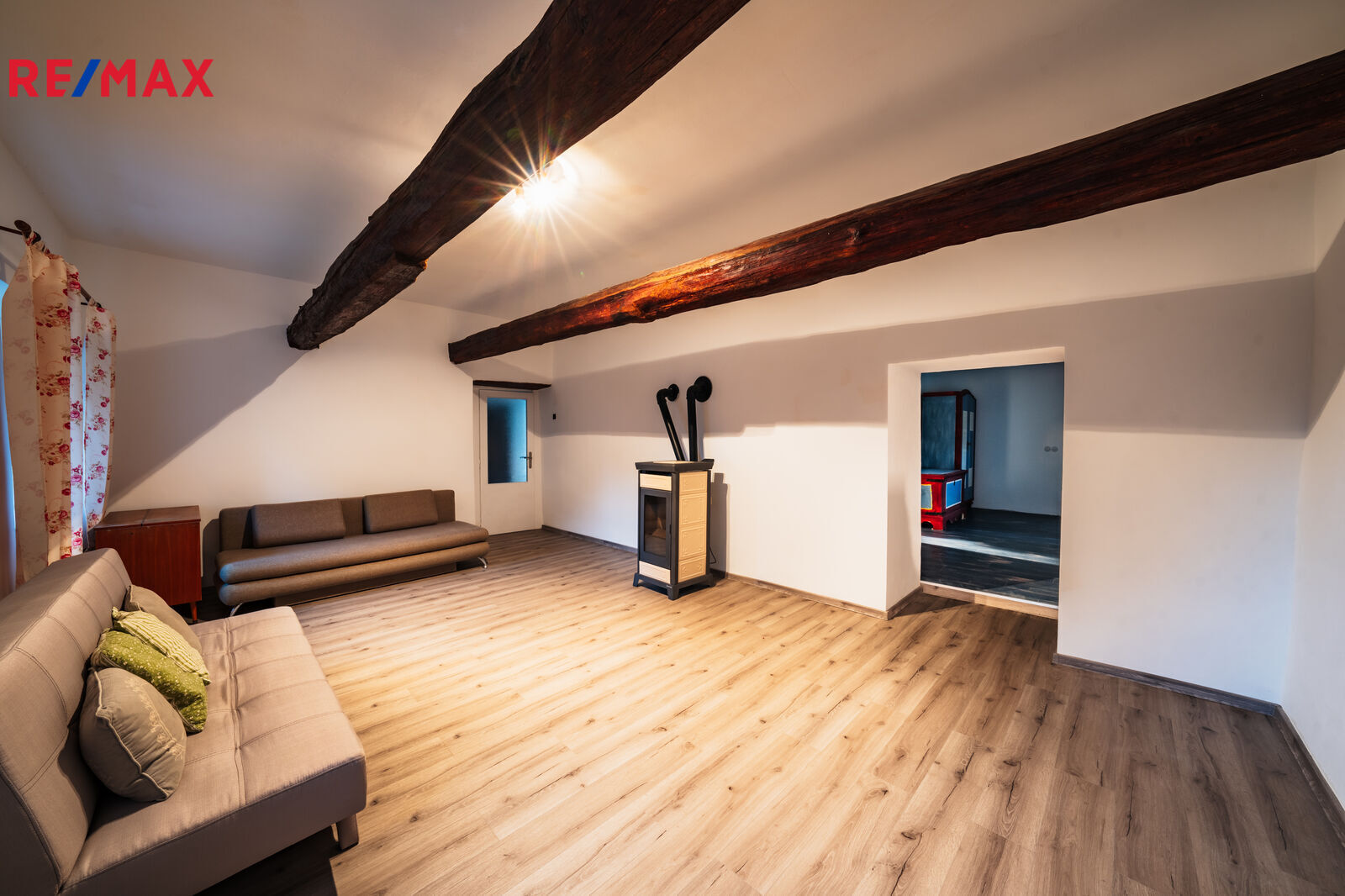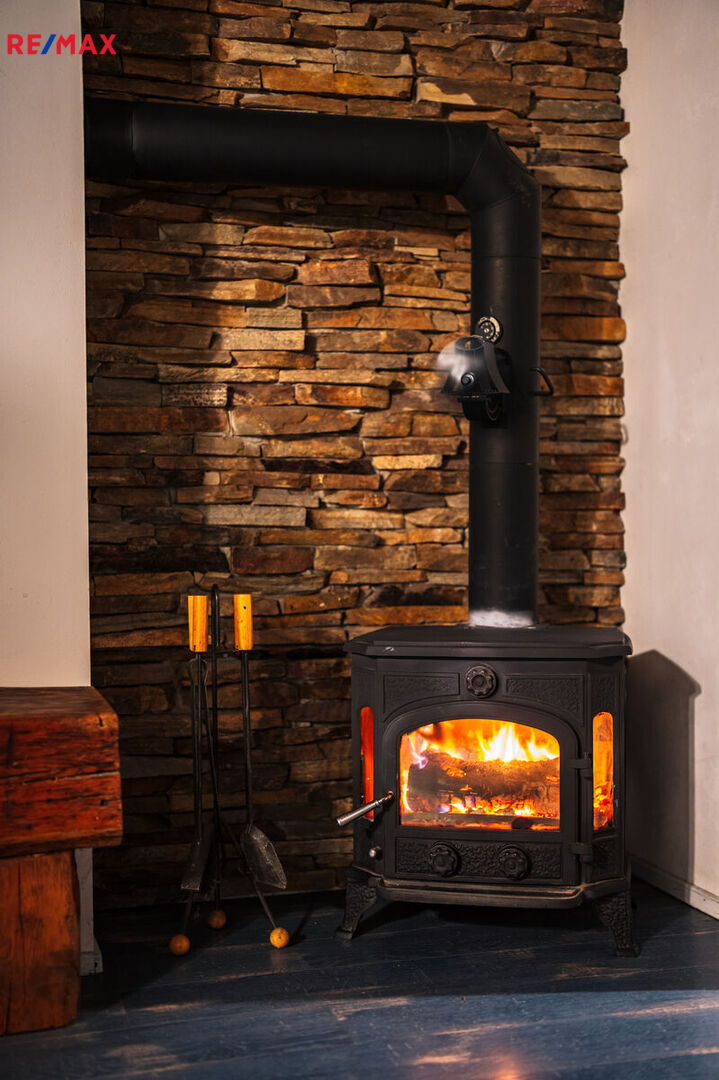 Vytápění domu je aktuálně řešeno na tuhá paliva, nicméně dům nabízí možnost přizpůsobení a instalace alternativního způsobu vytápění podle preferencí nového vlastníka.