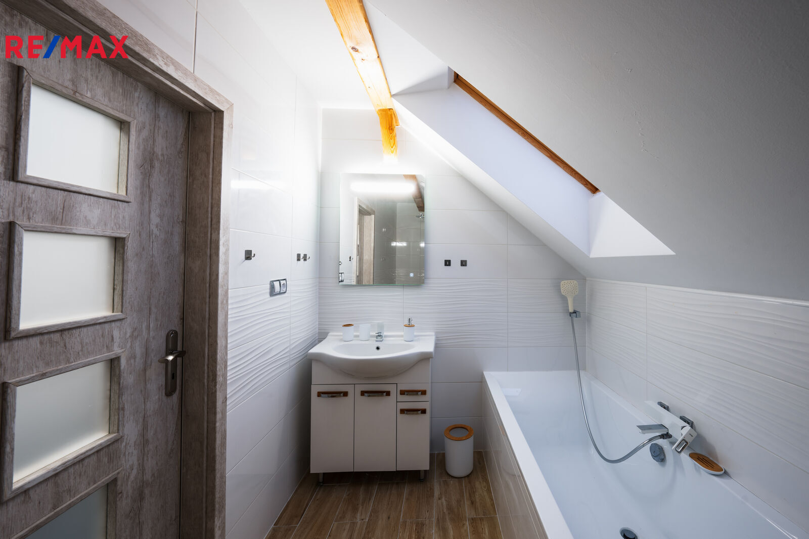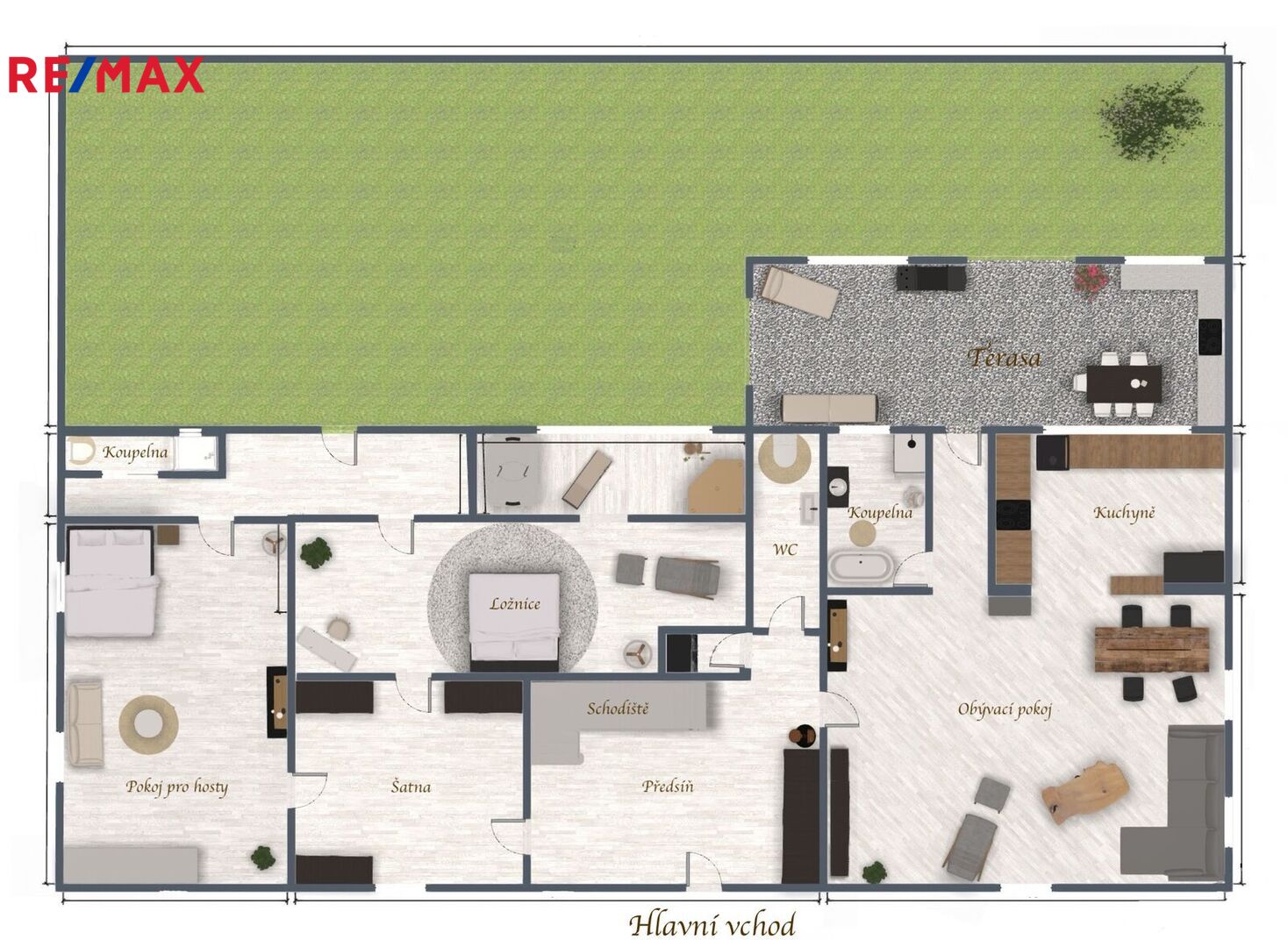 V 1. NP se nacházejí dvě koupelny, přičemž větší nabízí jak vanu, tak sprchový kout. Druhá koupelna je vybavena sprchovým koutem. Dominantou tohoto patra je prostorný obývací pokoj propojený s moderní kuchyní o velikosti 50 m². Dále zde naleznete technickou místnost, samostatné WC, šatnu, ložnici, pokoj pro hosty a relaxační místnost s krásným výhledem na zahradu, do které je přístup přímo z ložnice. K domu patří také velká terasa s venkovní kuchyní, která je ideální pro rodinné oslavy a letní grilování.