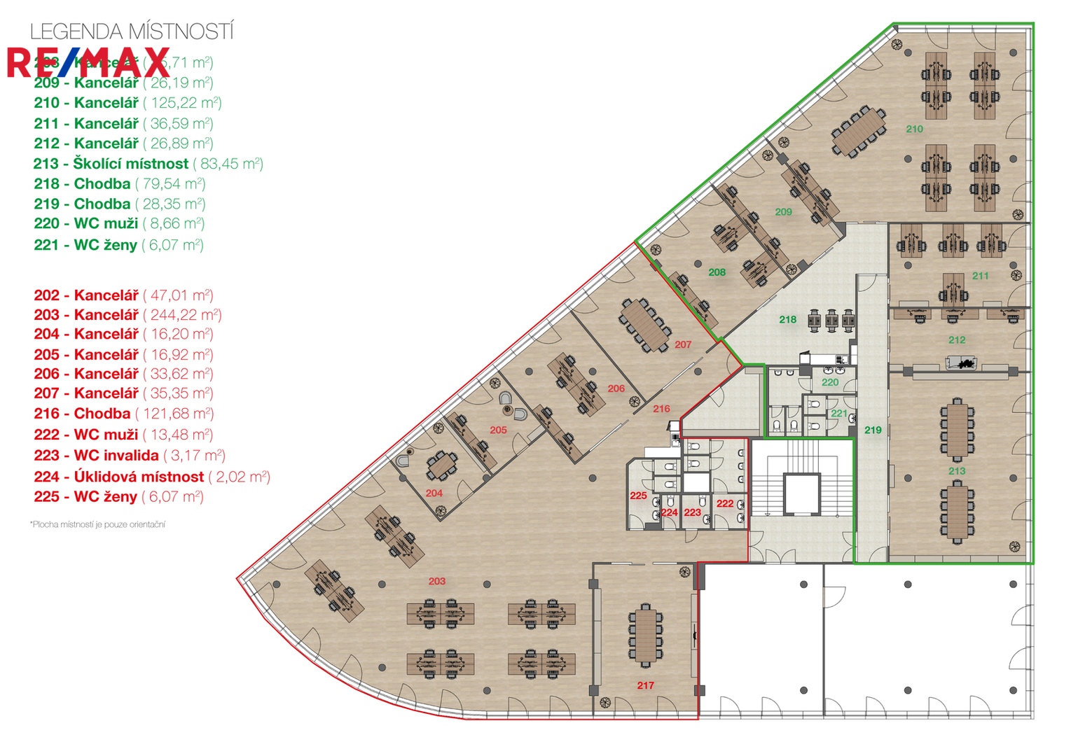 Celková plocha kanceláří činí 874,75 m². Prostory lze flexibilně rozdělit na dvě samostatné jednotky, každou s vlastním vstupem, kuchyňkou a sociálním zázemím.