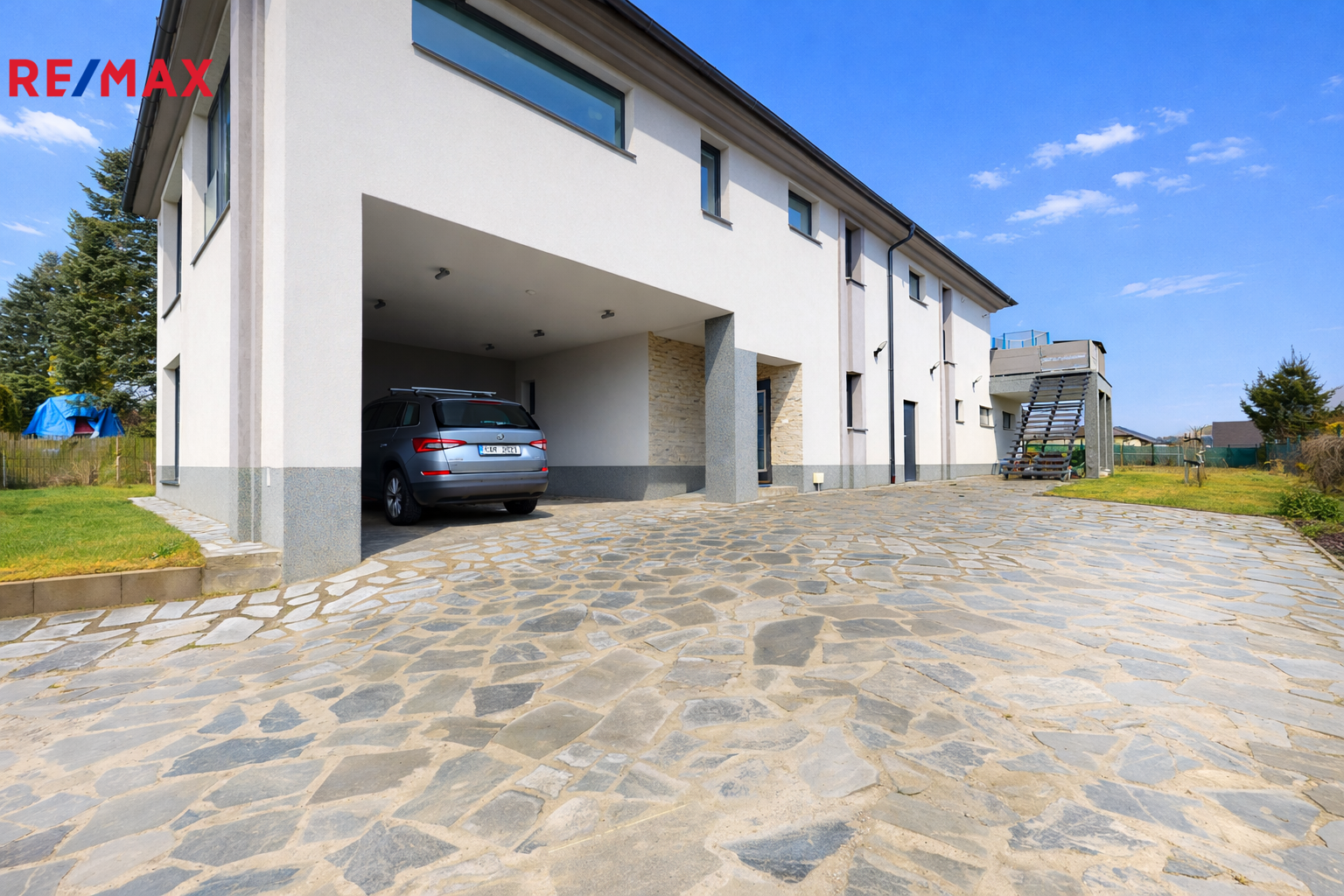 K dispozici jsou dvě krytá parkovací stání, na dvoře je prostor až pro šest automobilů, před domem další tři parkovací místa. Příjezdová cesta je vyhřívaná.