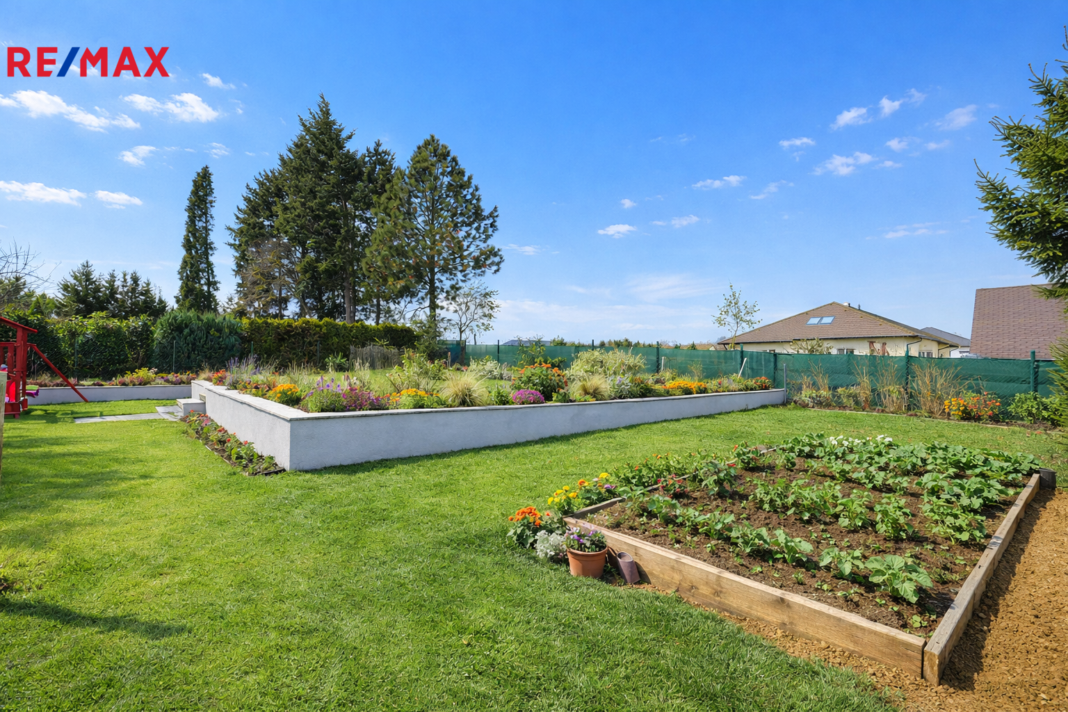 Zahrada je vybavena drenážním systémem, který efektivně odvádí přebytečnou vlhkost.