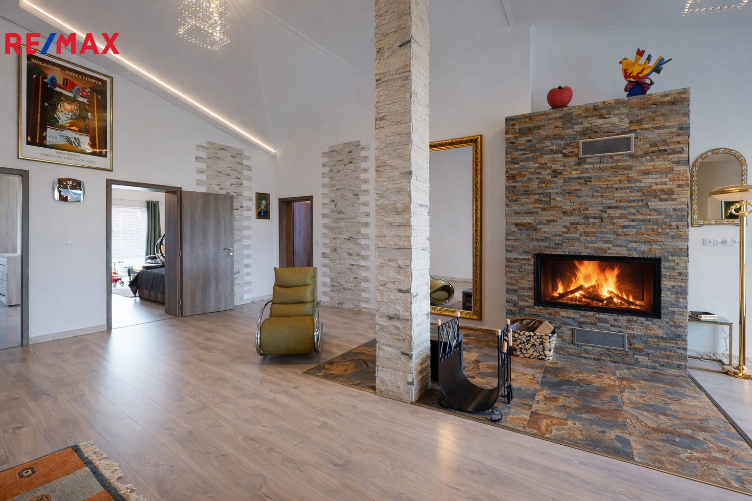 Dům je vybaven dvěma plnohodnotnými kuchyněmi, čtyřmi koupelnami a dvěma krby s horním zdvihem.