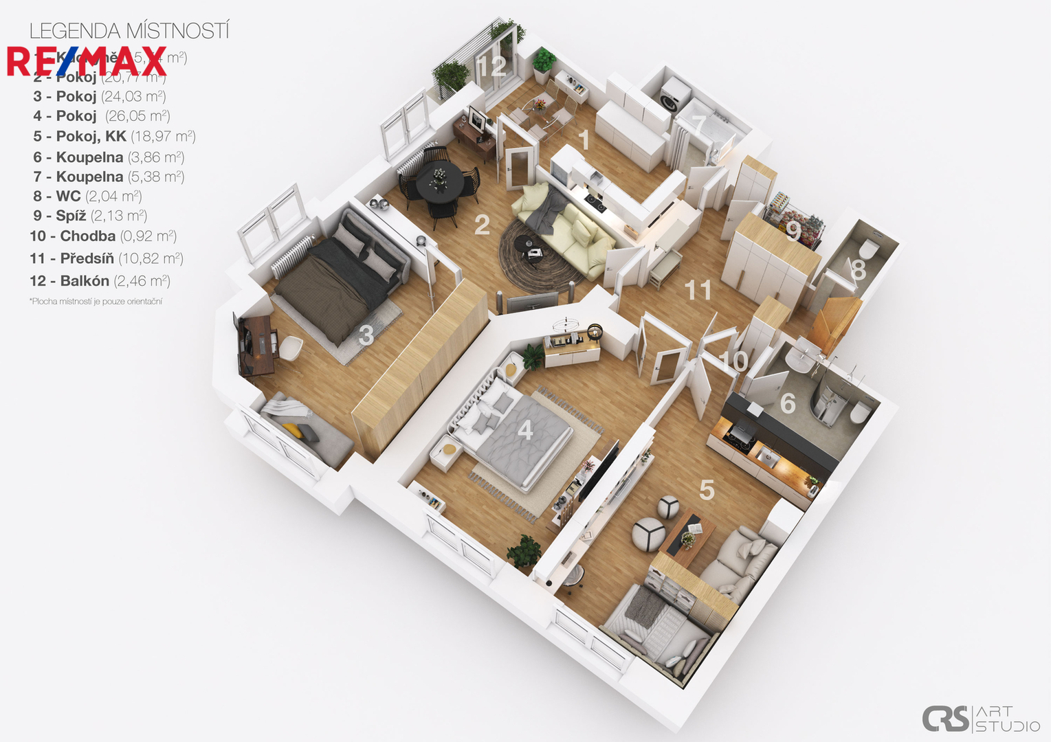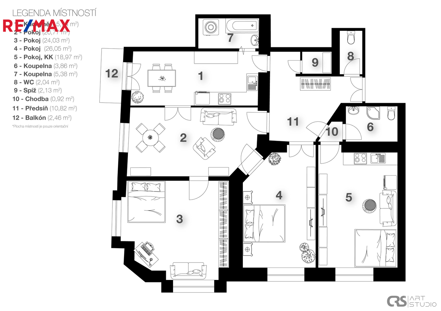 Dispozice bytu je mimořádně flexibilní a přímo vybízí k vytvoření reprezentativního, luxusního a velkolepého bydlení přesně podle Vašich představ. Velkorysé proporce místností, rohová orientace a vysoká okna přinášejí množství přirozeného světla a dávají vzniknout prostoru, který lze proměnit v exkluzivní rezidenci s důrazem na design, komfort a soukromí.