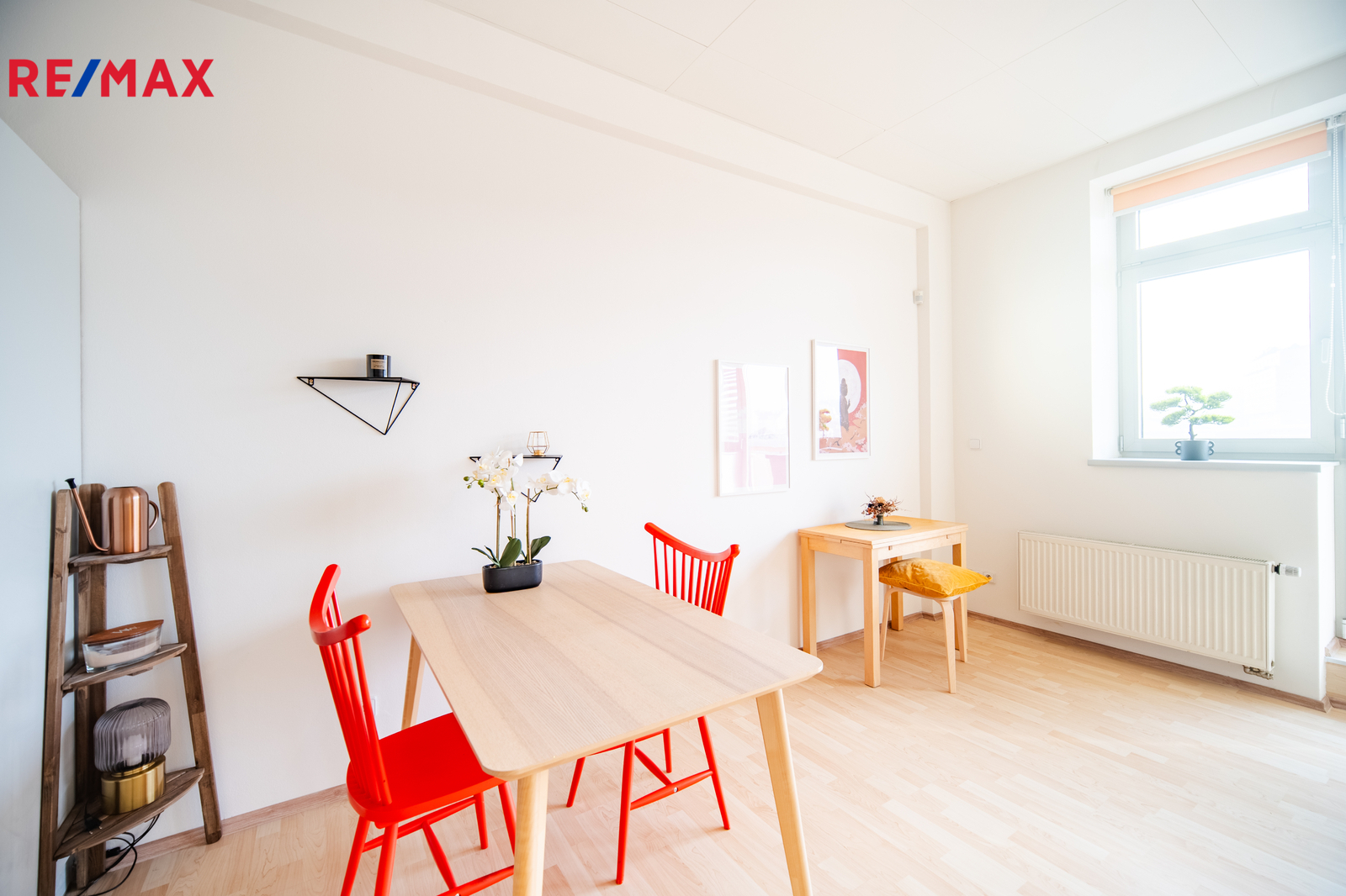 Dominantou bytu je světlý obývací pokoj s kuchyňským koutem a jídelní částí o velikosti téměř 30 m², který poskytuje příjemný prostor pro každodenní život i setkávání s přáteli.