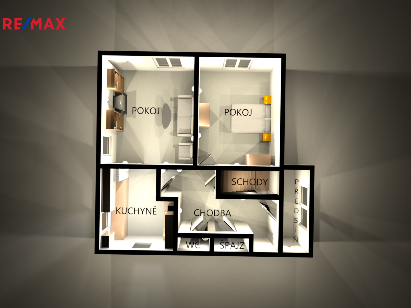 Dispozice domu zahrnuje čtyři pokoje, šatnu, kuchyň, dvě samostatné toalety, koupelnu a špajz.