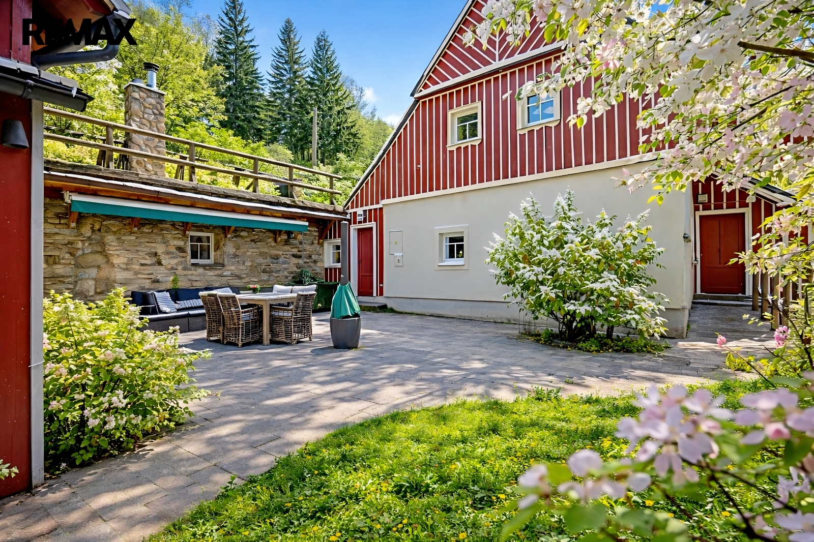 U domu se nacházejí tři venkovní terasy, hlavní je s venkovním krbem, v patře je terasa s ohništěm a třetí relaxační terasa s vířivkou HotSpring. Součástí je garáž pro 4 vozy. Chalupu obklopuje pozemek o velikosti 27.504m2, jedná se o jedno z nejzachovalejších krkonošských údolí, kde naleznete pouze původní chalupy a klid. Nemovitost stojí v klidné neprůjezdné části obce Horní Dušnice obklopená lesy a loukami. Nejbližší lyžařské středisko je Horní Rokytnice, kde se nově buduje nový špičkový lyžařský areál, přes kopec se nachází lokalita Vítkovice s nočním lyžováním a možností SkiAlpy přímo od chalupy. Prodávající si vyhrazuje právo vybrat kupujícího na základě jím zvolených kritérií.