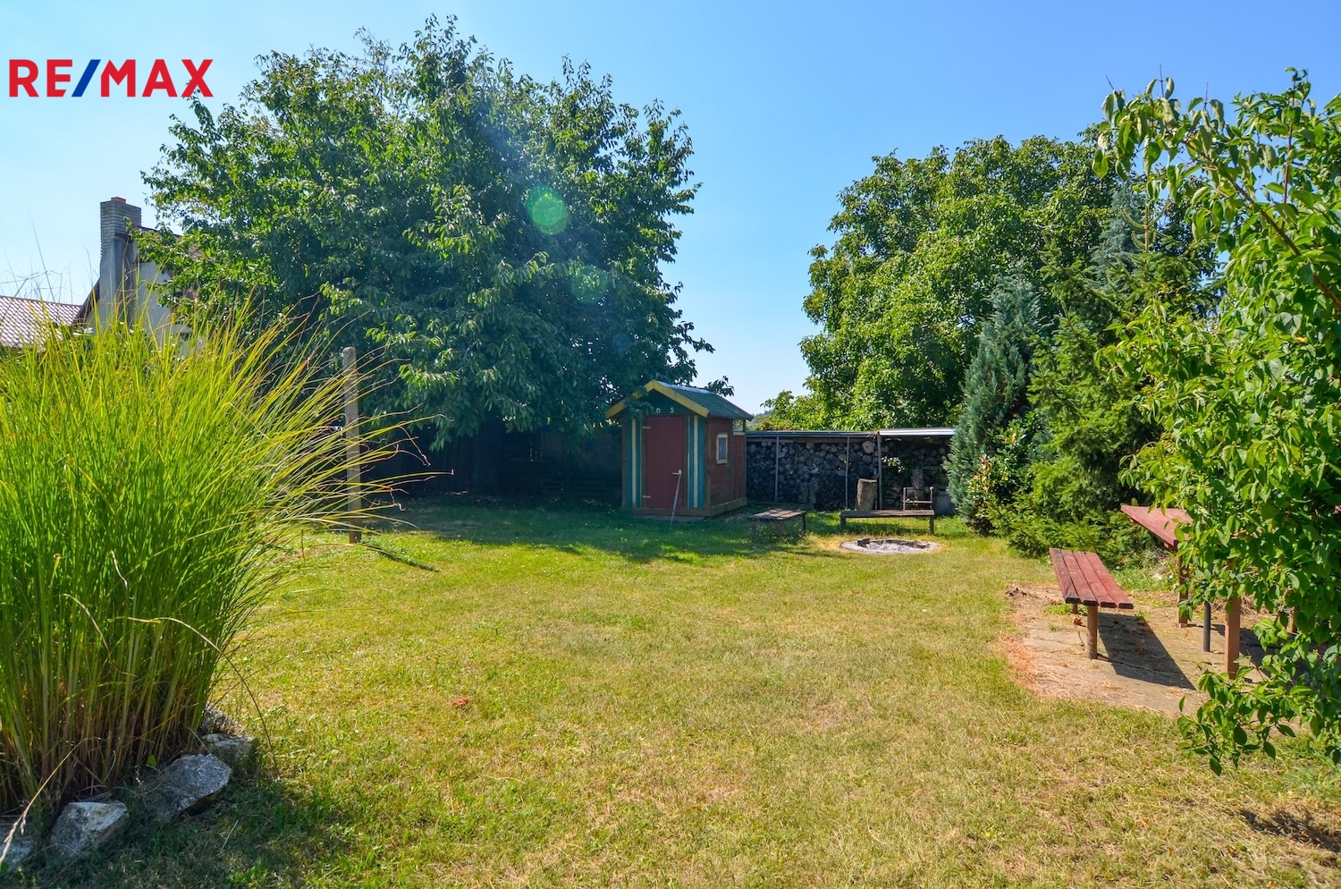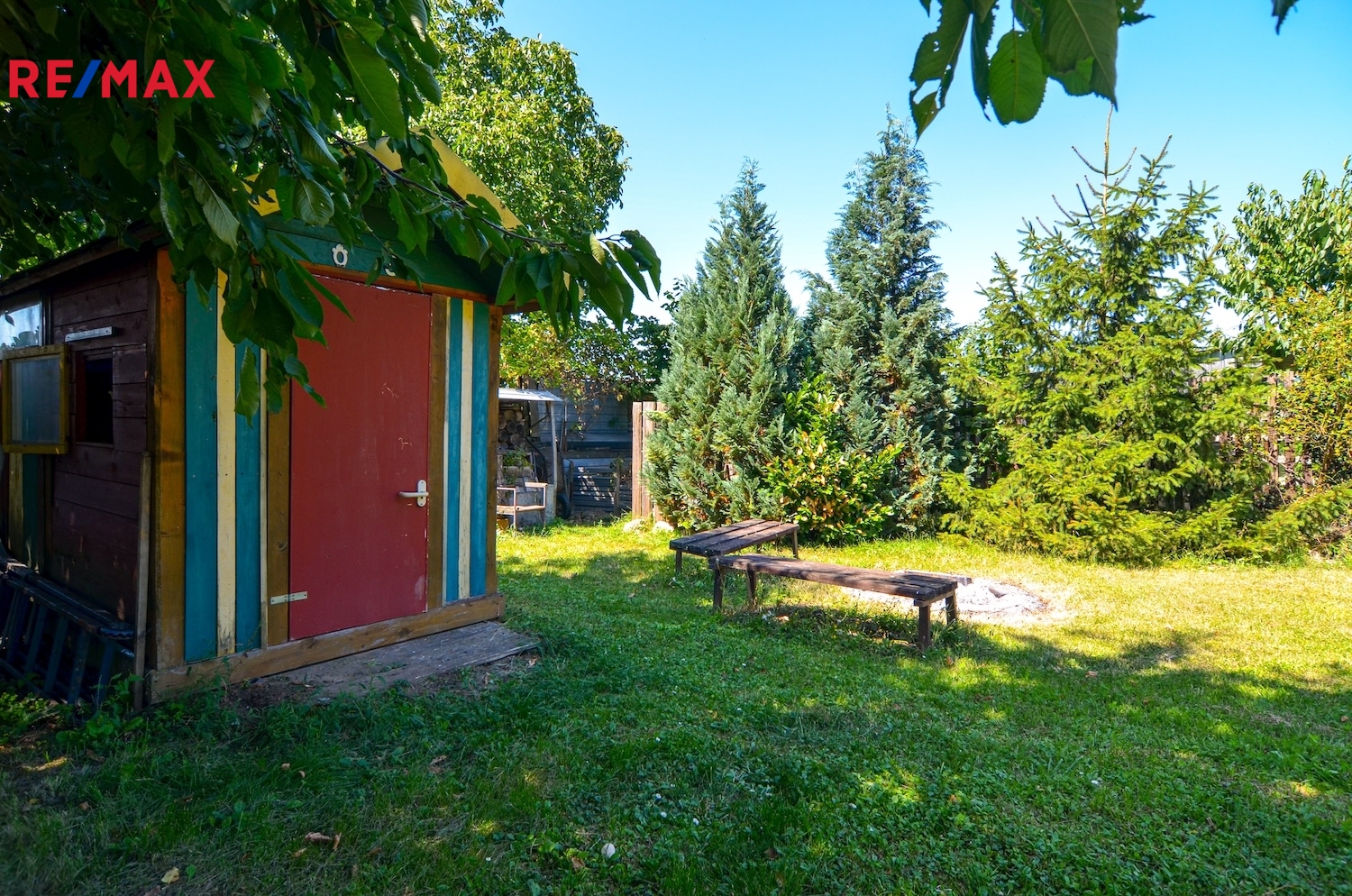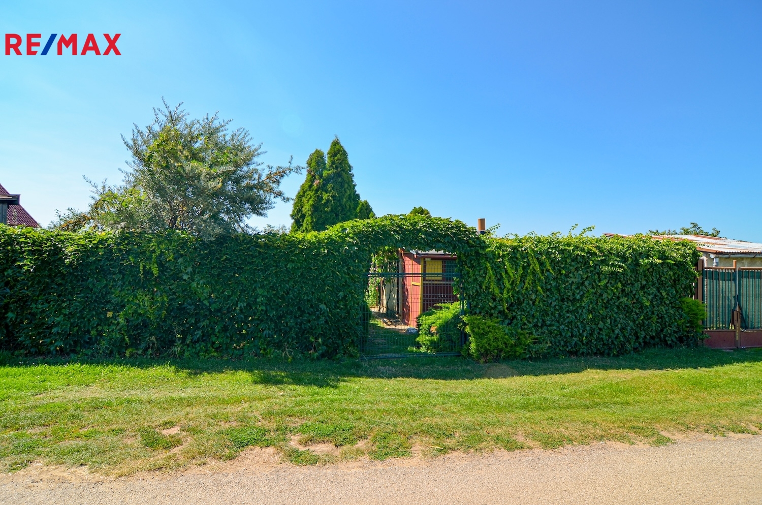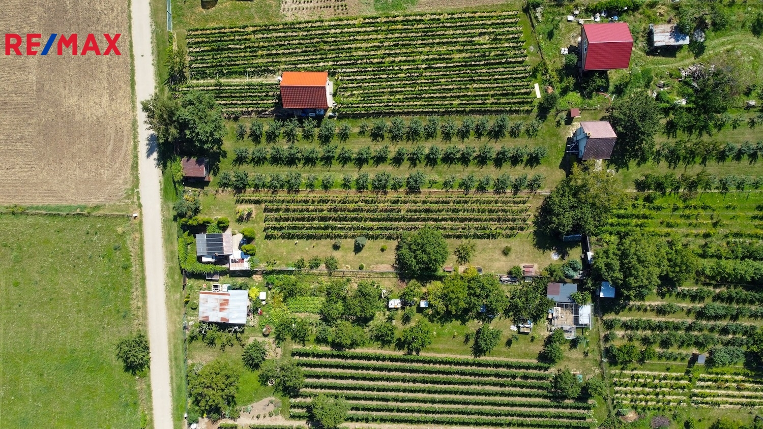 Na pozemku stojí menší zděná chatka se sedlovou střechou, která je v dobrém technickém stavu, s udírnou a posezením. Chatka je zapsána v katastru nemovitostí (stavba pro rodinnou rekreaci) a lze ji také případně rekonstruovat nebo nahradit novou stavbou dle aktuálních regulativ. Chatka není napojena na elektřinu, vedení se však nachází přímo u hranice pozemku. Dostatek vody i v sušších měsících zabezpečují čtyři sběrné nádrže dešťové vody, každá o velikosti 1000 litrů. Přístup k zahradě je zajištěn po obecní zpevněné komunikaci.