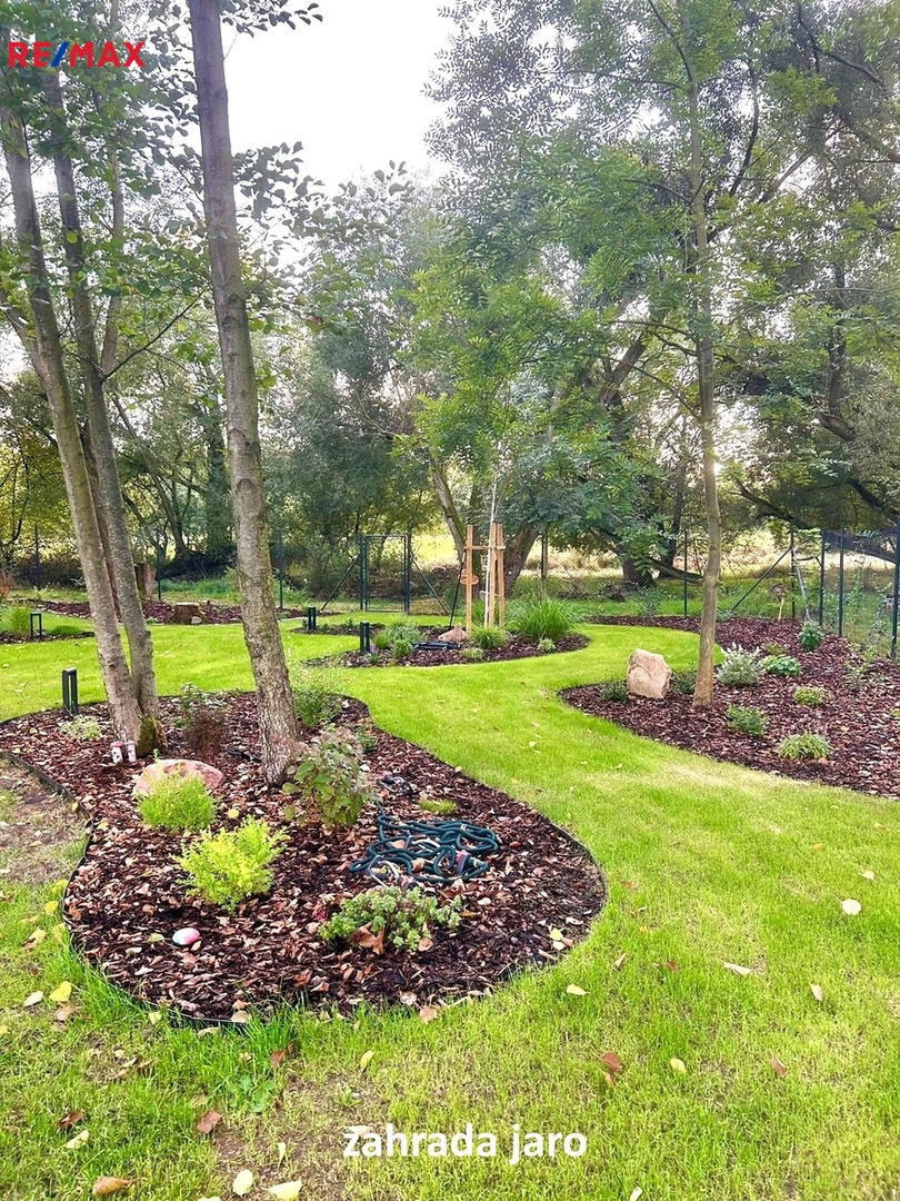 Zahrada je rovinatá, v dolní části byla založena na základě projektu vytvořeného zahradním architektem, od domu je oddělena terasou s opěrnou zdí. Dešťová voda je svedena do retenční nádrže o objemu 8 m3 s rozvody po zahradě (4 přípojné body). Na zahradu navazuje louka se stavební uzávěrou, i do budoucna je tak zajištěno soukromí na pozemku zahrady.