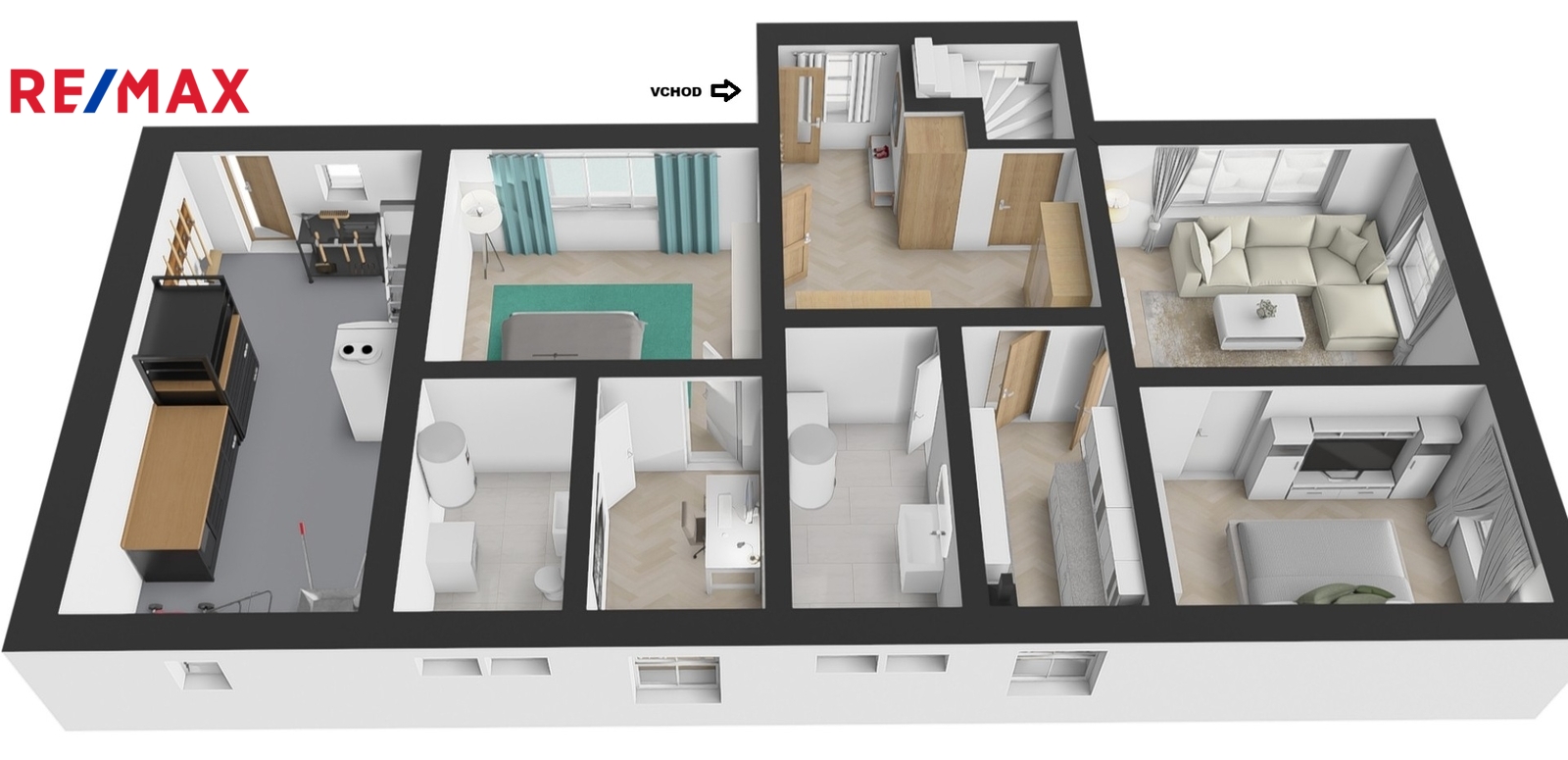 • Podkroví: Prostorná půda s jedním již vybudovaným pokojem (14 m²), ideální pro další vestavbu.