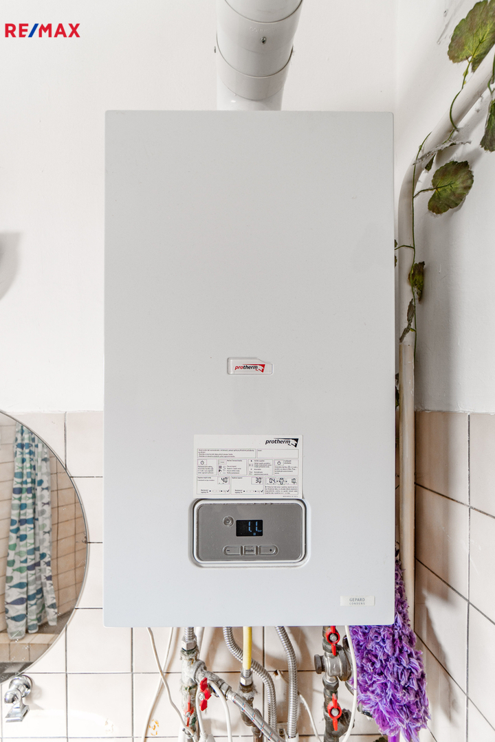 Byt se nachází ve 2. nadzemním podlaží z celkových 2 v menším a klidném domě s pouhými 4 bytovými jednotkami, což přináší více soukromí a příjemnější sousedské prostředí. Dům je napojen na obecní vodovod, kanalizaci, elektřinu a plyn. Vytápění zajišťuje plynový kotel Protherm, ohřev teplé vody bojler Thermona o objemu 80 l a komfort regulace teploty doplňuje pokojový termostat.