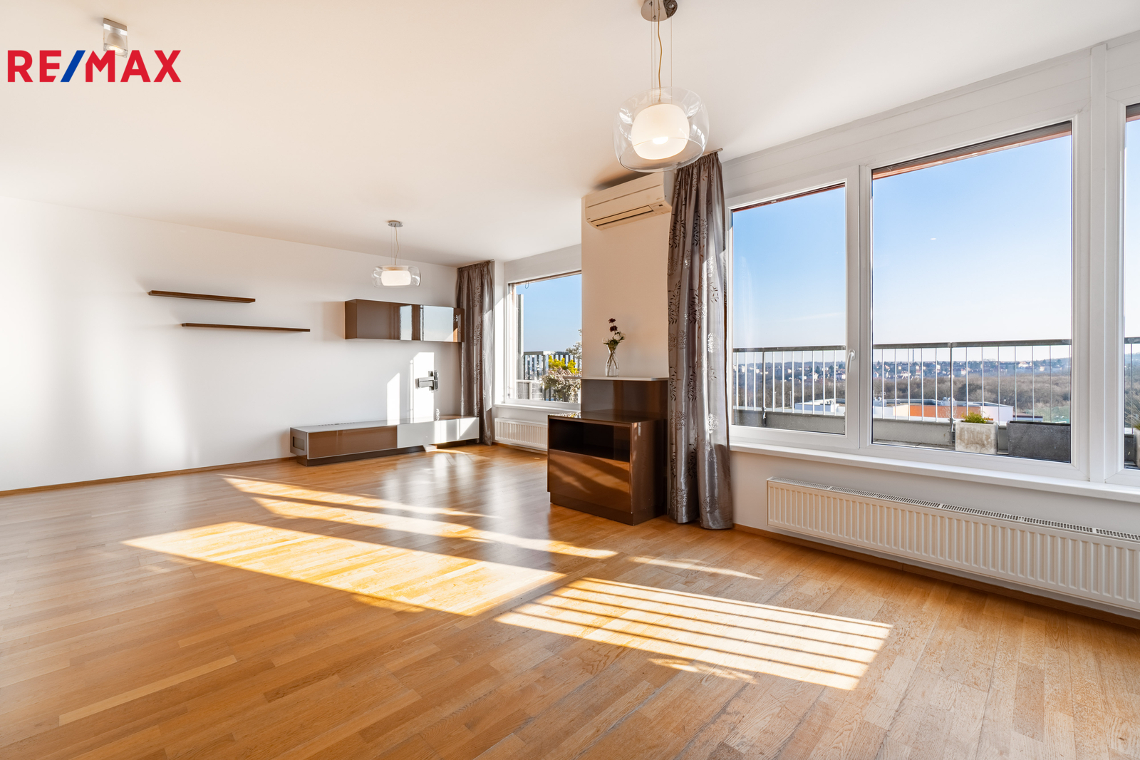 Byt se nachází ve 4. a 5. nadzemním podlaží s výtahem a nabízí celkovou obytnou plochu 116 m². Velkým benefitem jsou tři prostorné terasy o celkové výměře 86 m², které poskytují krásný výhled na panorama Prahy a ideální prostor pro relaxaci.