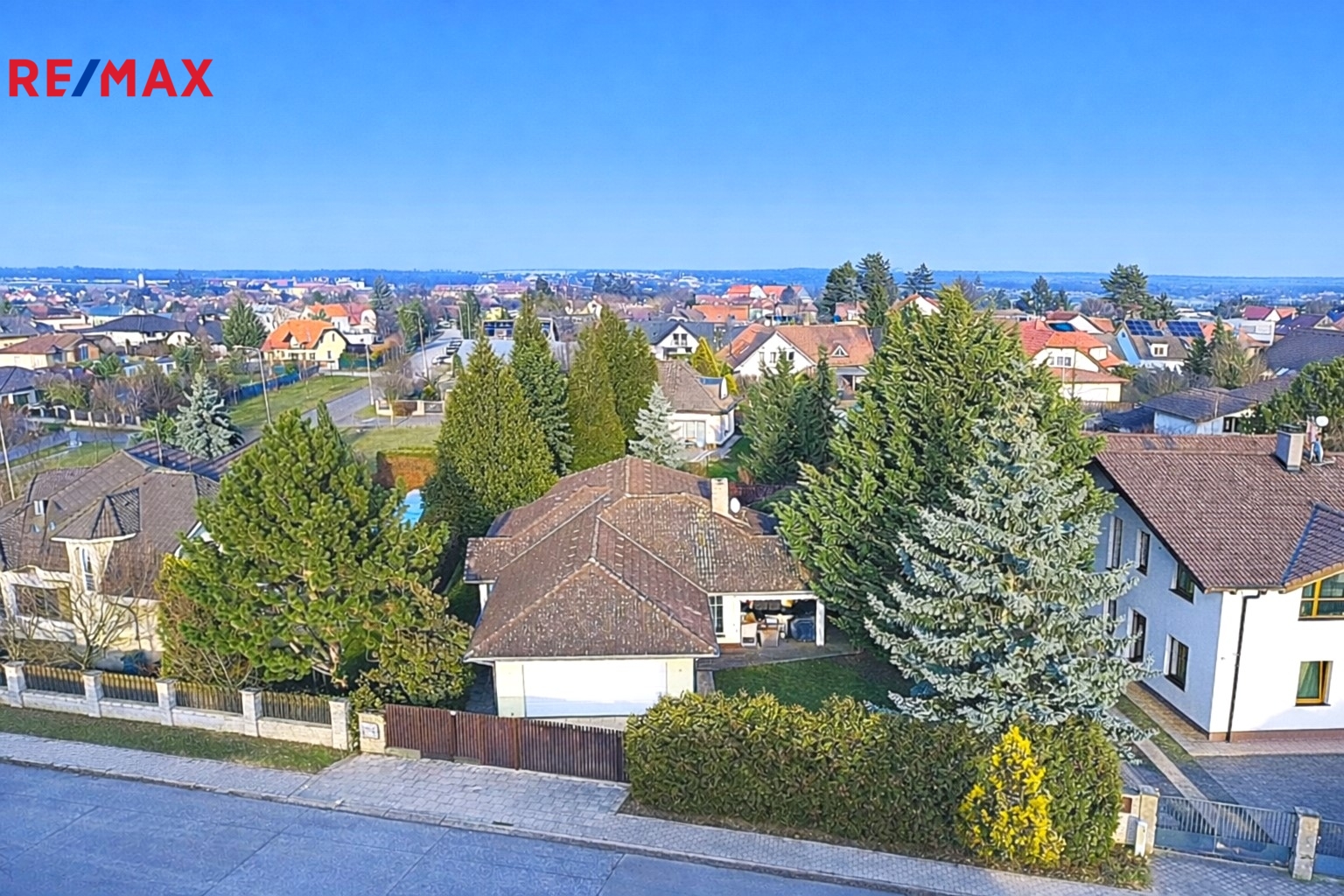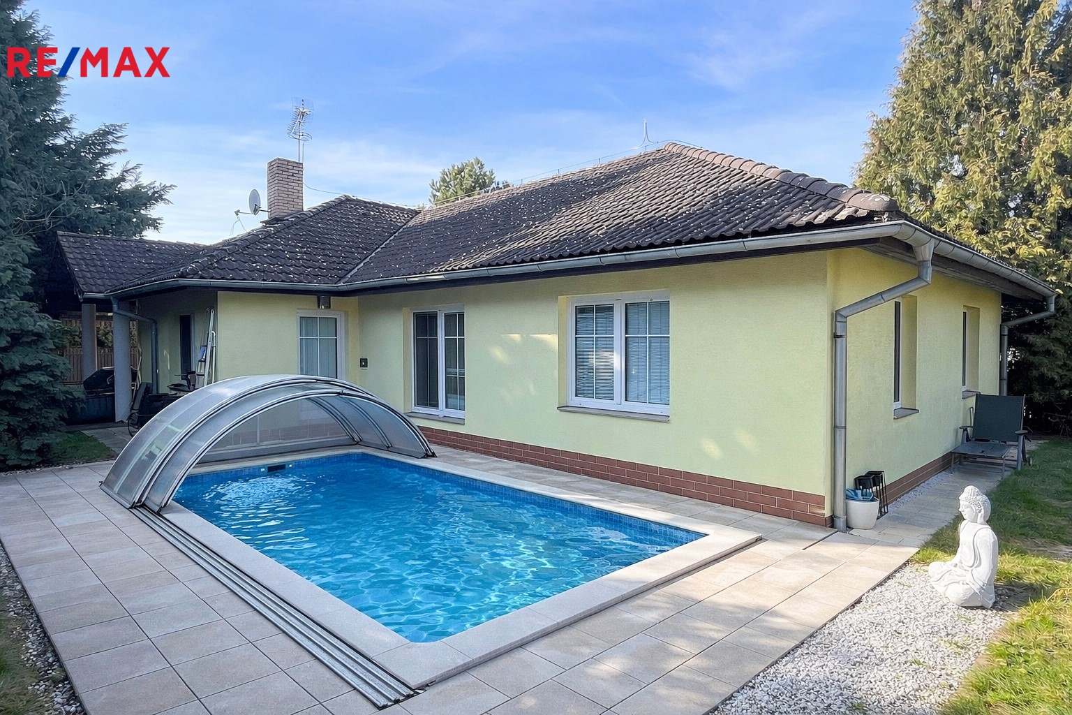 Dům stojí na pozemku o velikosti 776 m² a nabízí udržovanou zahradu se vzrostlými stromy, která poskytuje dostatek soukromí i příjemné prostředí pro odpočinek. K dispozici krytá terasa, zastřešený venkovní bazén a dostatek prostoru pro relaxaci i rodinné aktivity.