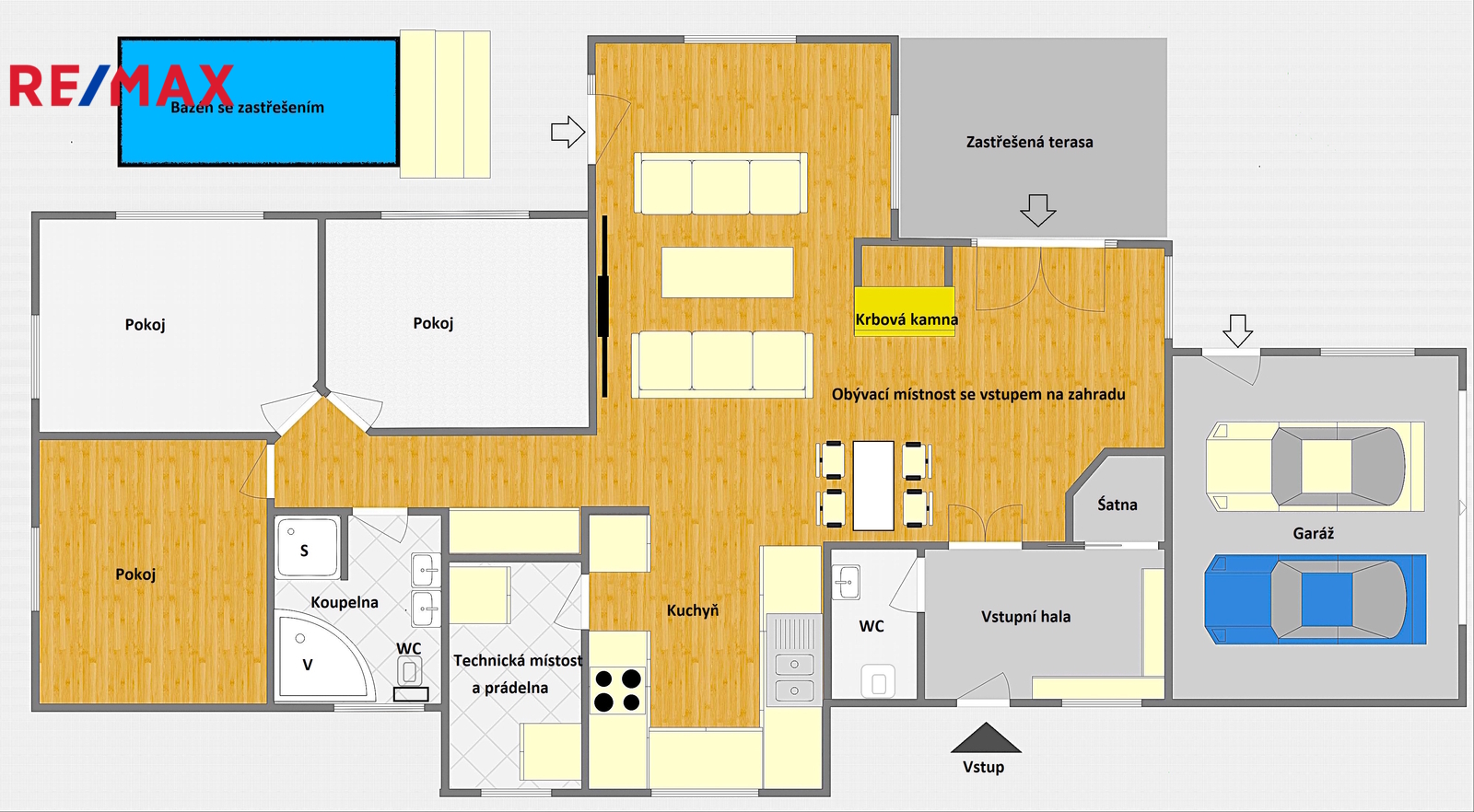 Z obývacího pokoje vedou dva vstupy na krytou terasu, která přechází do zahrady se zastřešeným venkovním bazénem – ideální místo pro relaxaci i letní posezení.
