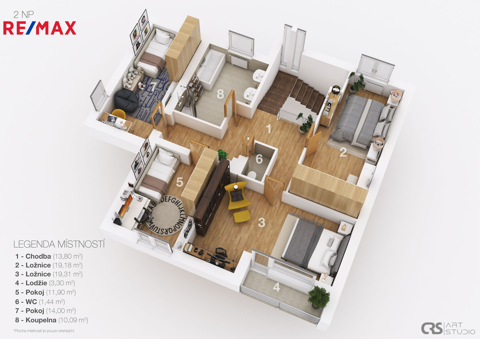 V patře o celkové podlahové ploše 93,02 m² se nachází tři samostatné pokoje, z nichž jeden má vstup na balkón. Dále je zde koupelna, samostatné WC a komora, kterou lze využít jako šatnu nebo úložný prostor.