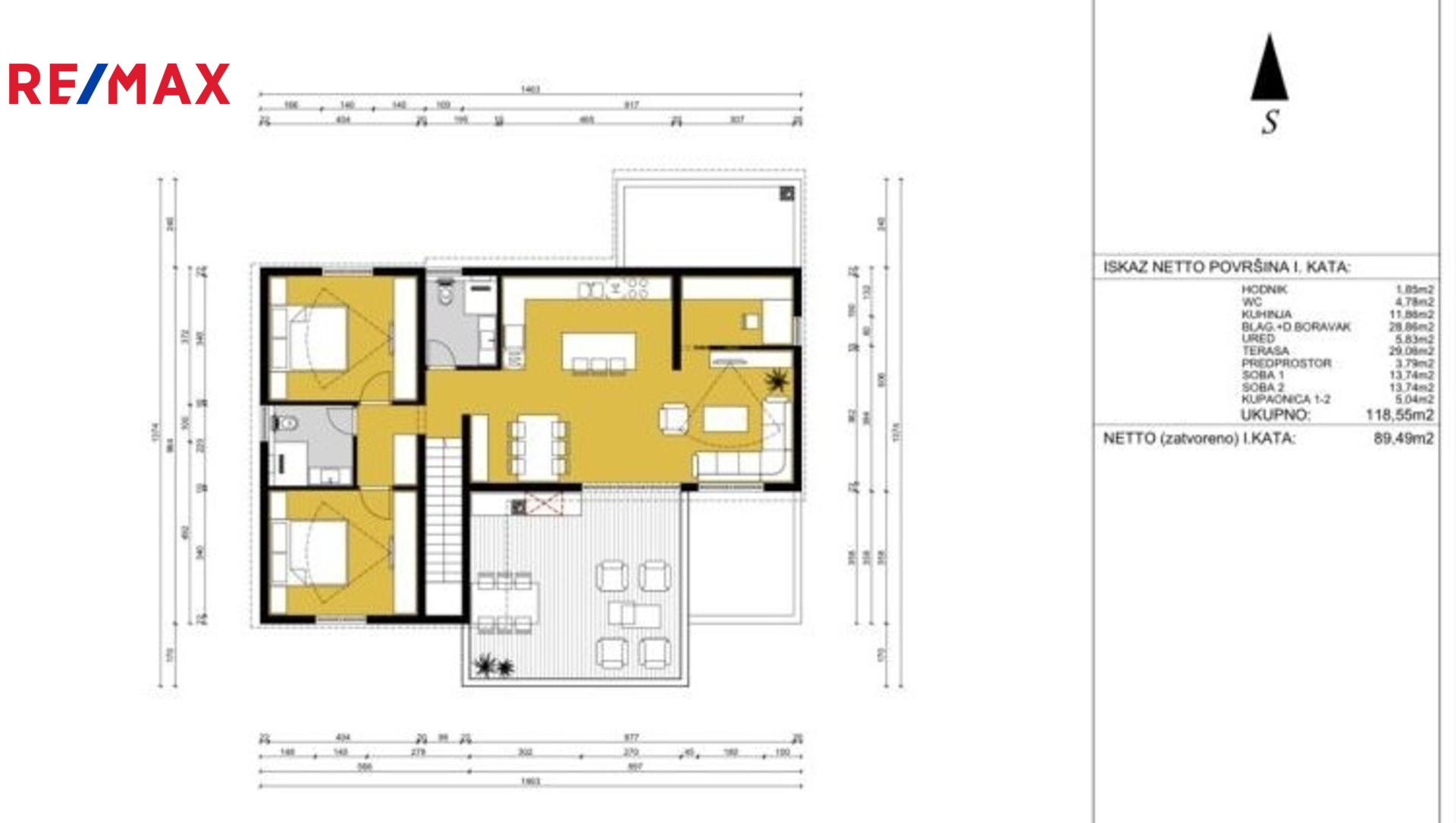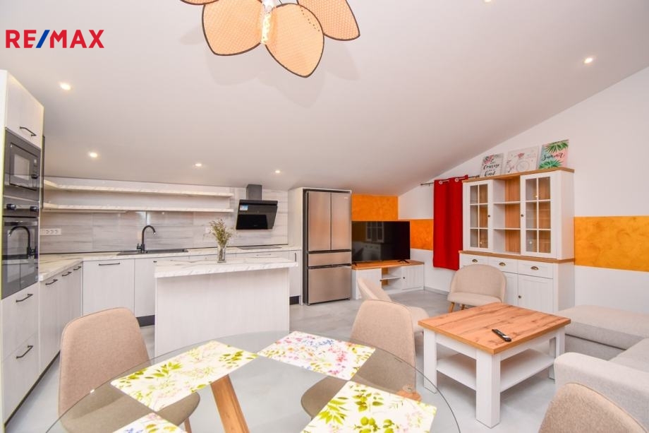 V patře - po vystoupení po vnitřním schodišti se nachází další byt o rozloze 118,55 m2, který se skládá z: chodby s toaletou, 2 ložnic s koupelnou, vstupní haly, pracovny, obrovské kuchyně s jídelnou a obývacího pokoje s přístupem na jižní slunnou terasu.