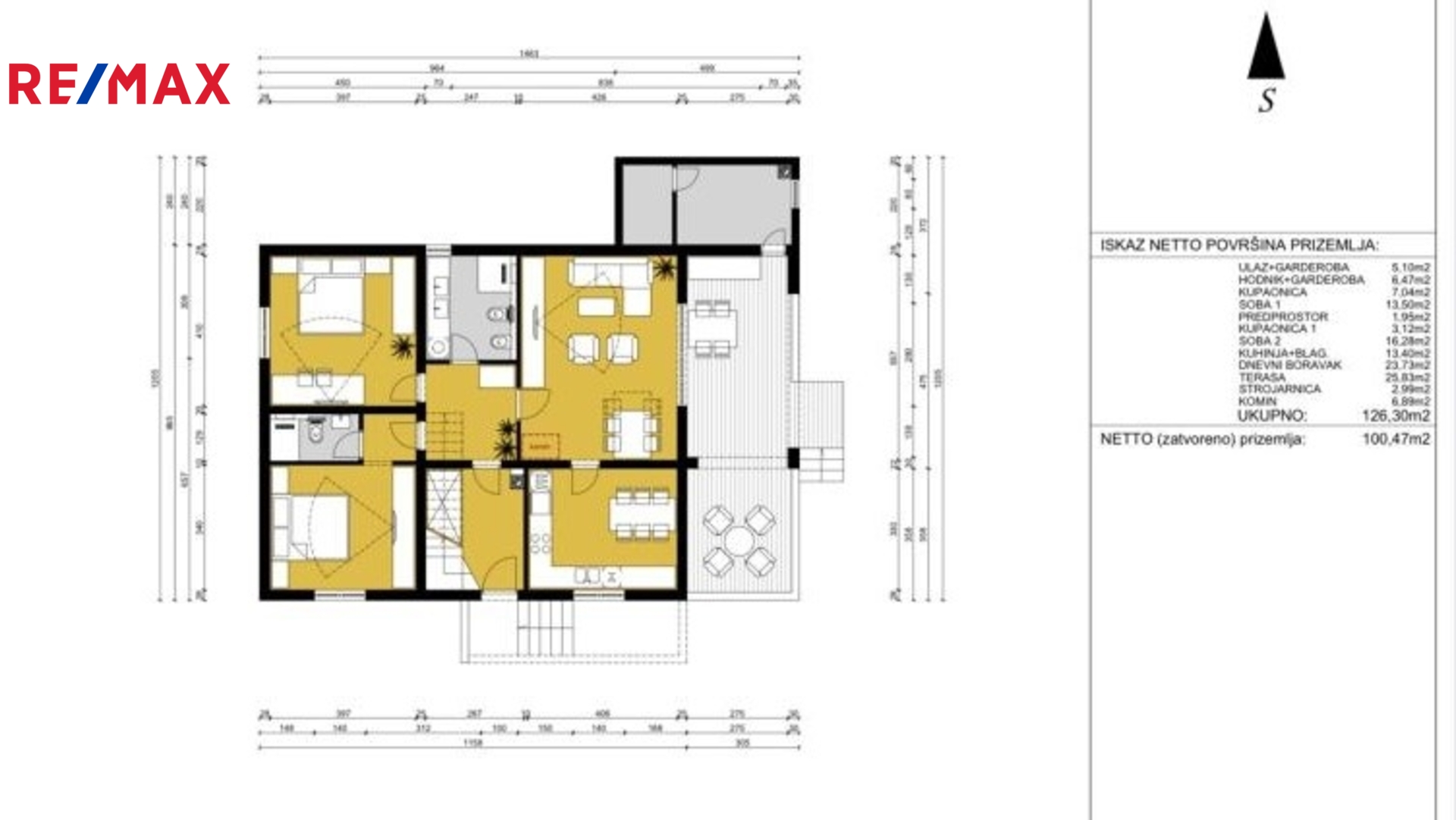 V přízemí se nachází komfortní byt o rozloze 126,30 m2, který se skládá ze vstupní haly a předsíně se skříněmi, 2 ložnic, 2 koupelen, kuchyně s jídelnou a obývacího pokoje s přístupem na východní uzavřenou lodžii (kde se nachází toaleta pro hosty), s výhledem na zelenou zahradu a bazén.