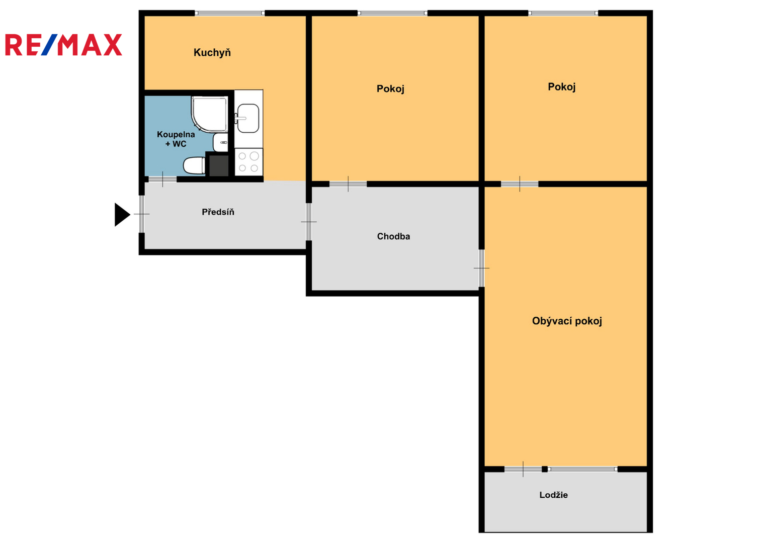 Podlahy: obytné místnosti – lino; kuchyně, koupelna, WC a chodba – dlažba.