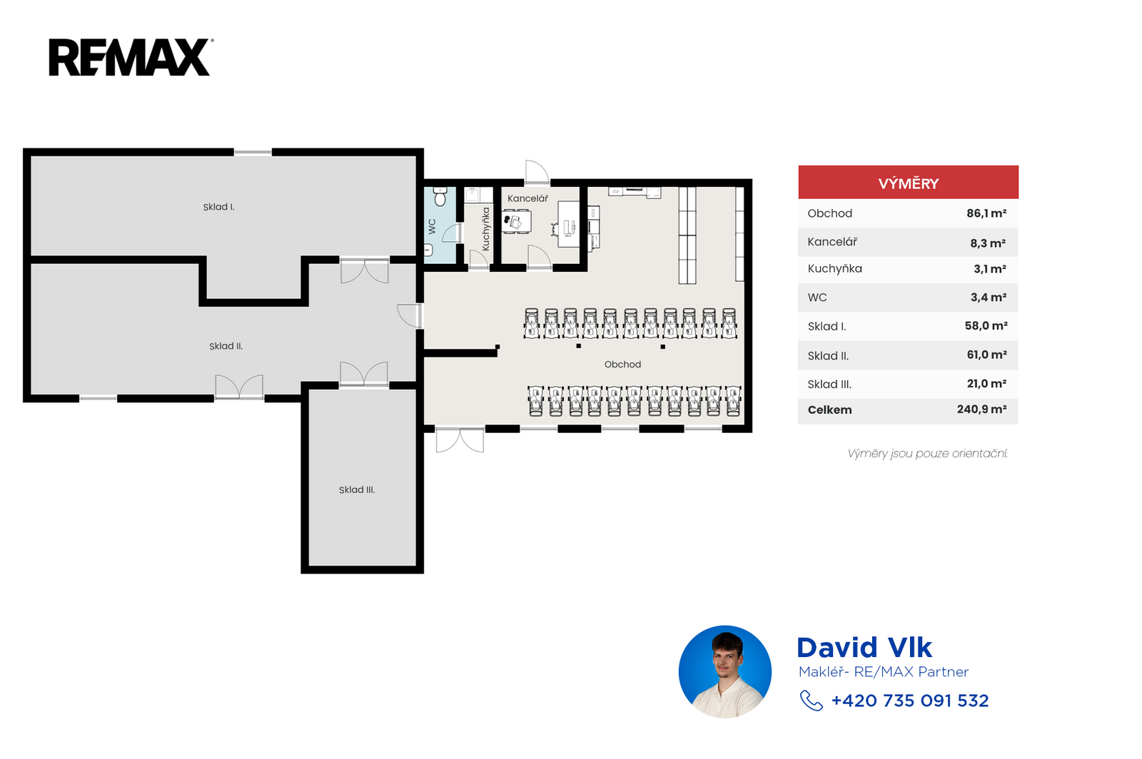 Dispozice je navržena velmi prakticky. Celek je díky tomu vhodný pro prodej, servis, skladování, showroom, dílnu, kancelářské zázemí i kombinaci více činností v rámci jednoho místa.