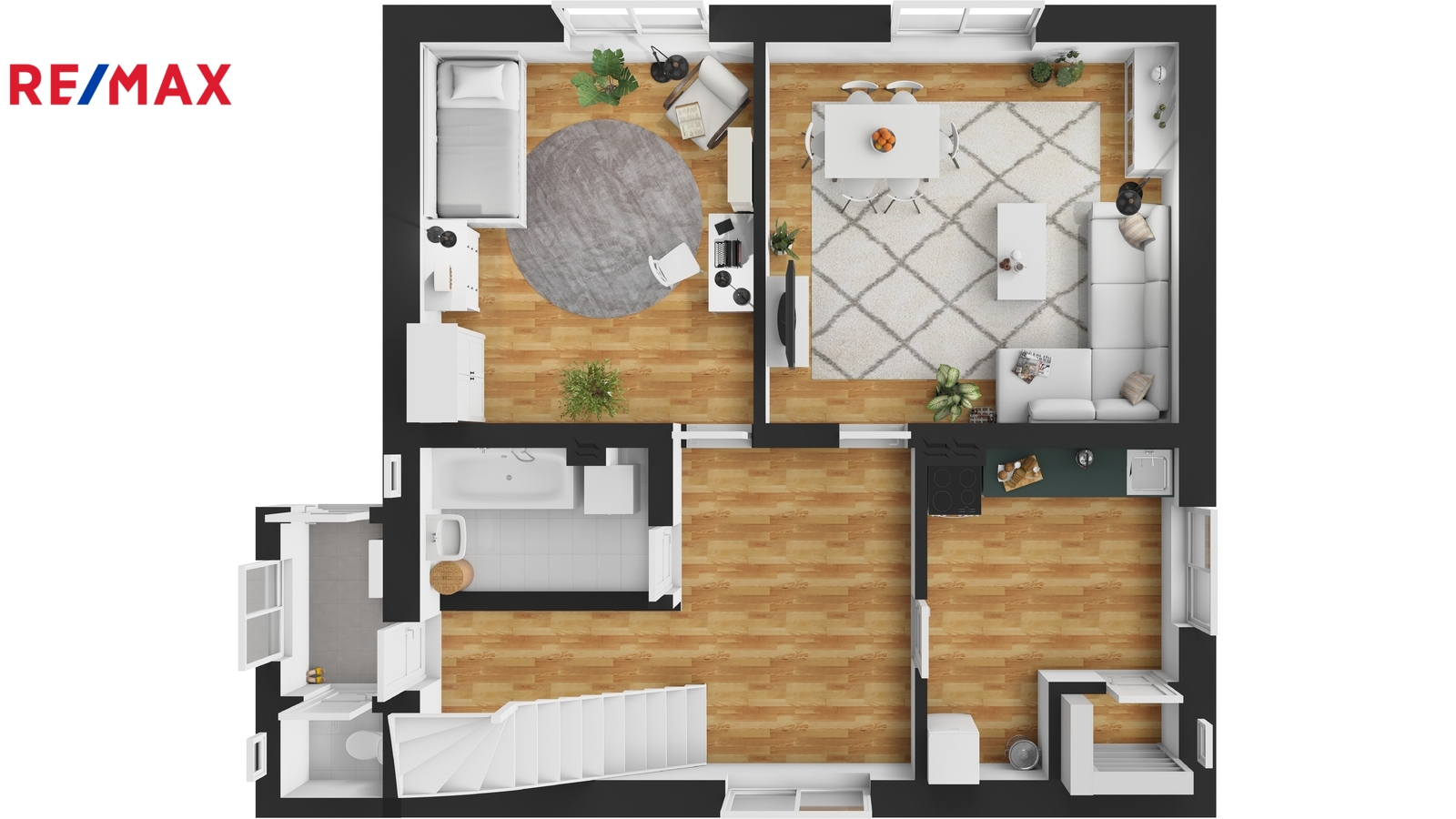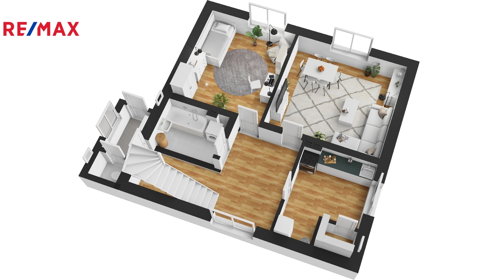 Přízemí nabízí prostornou předsíň, kuchyni s jídelní částí, obývací pokoj, další pokoj, koupelnu a samostatné WC.