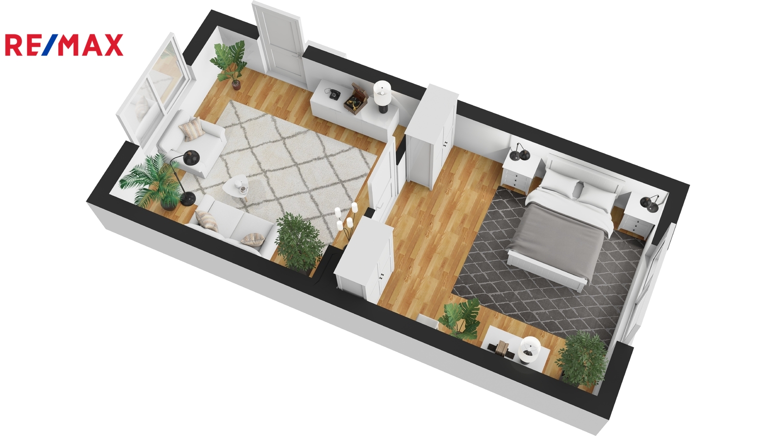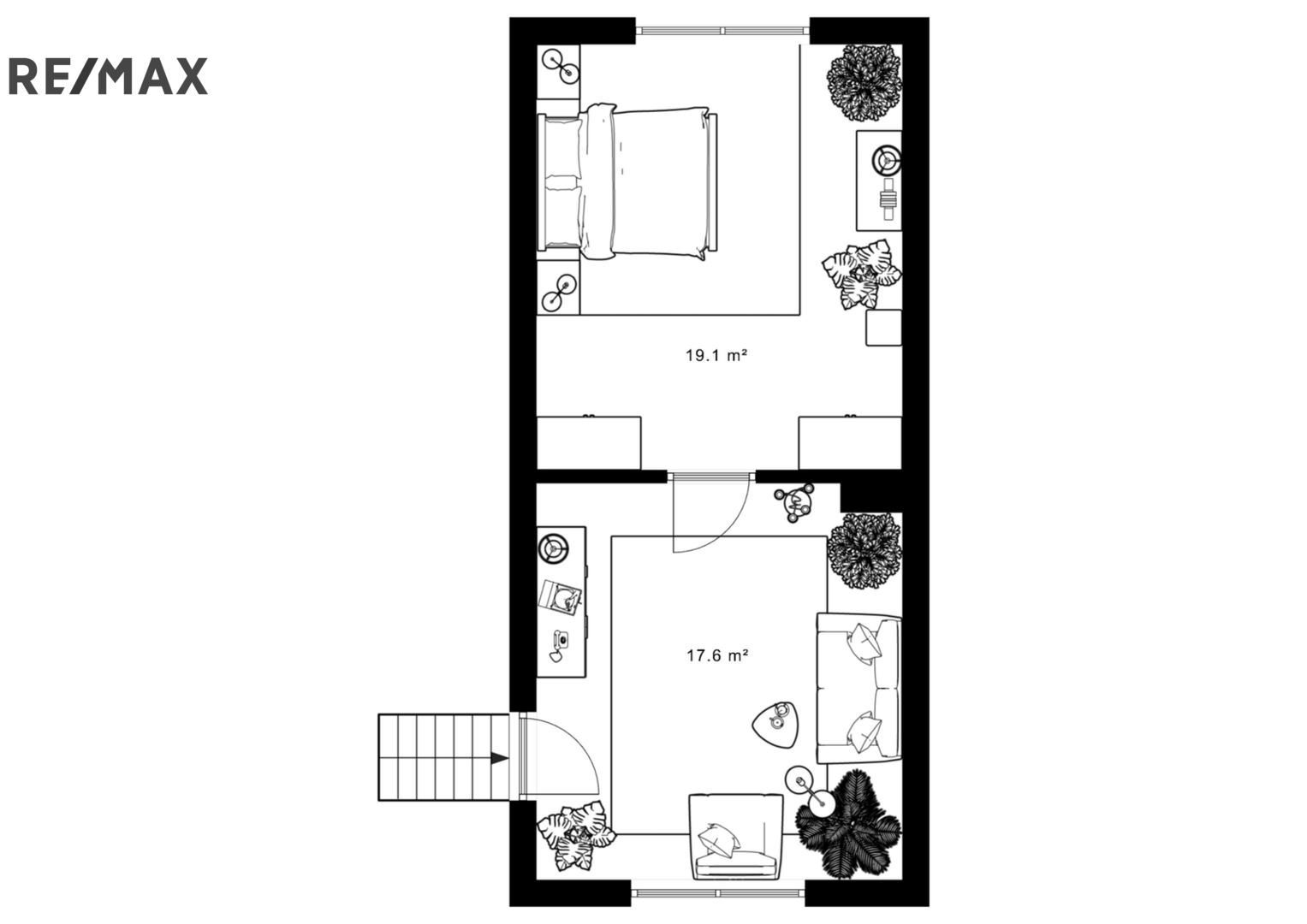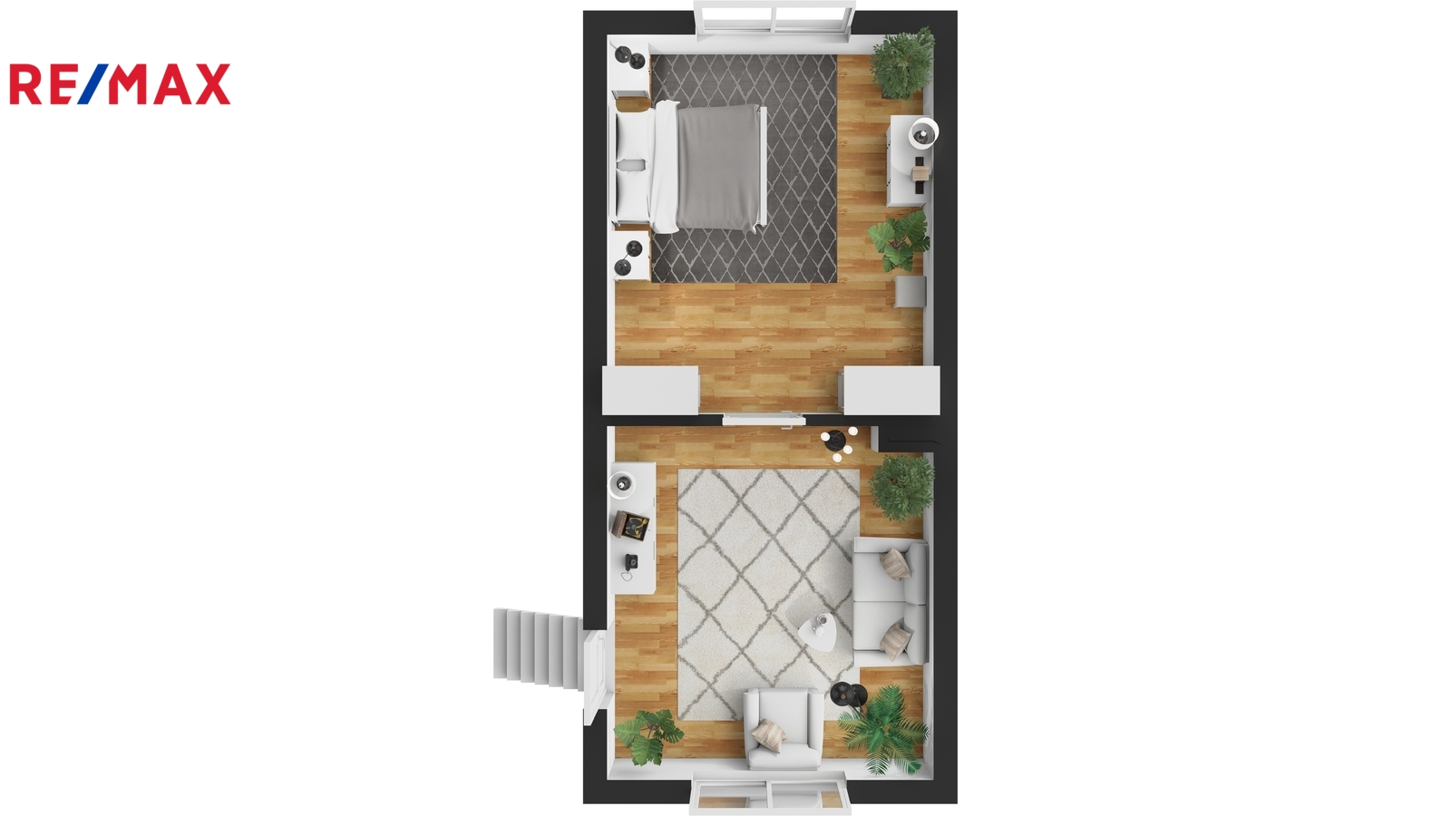 Podkroví se skládá ze dvou pokojů a další místnosti s přívodem vody a odpadu, kterou lze využít jako koupelnu nebo kuchyňku.