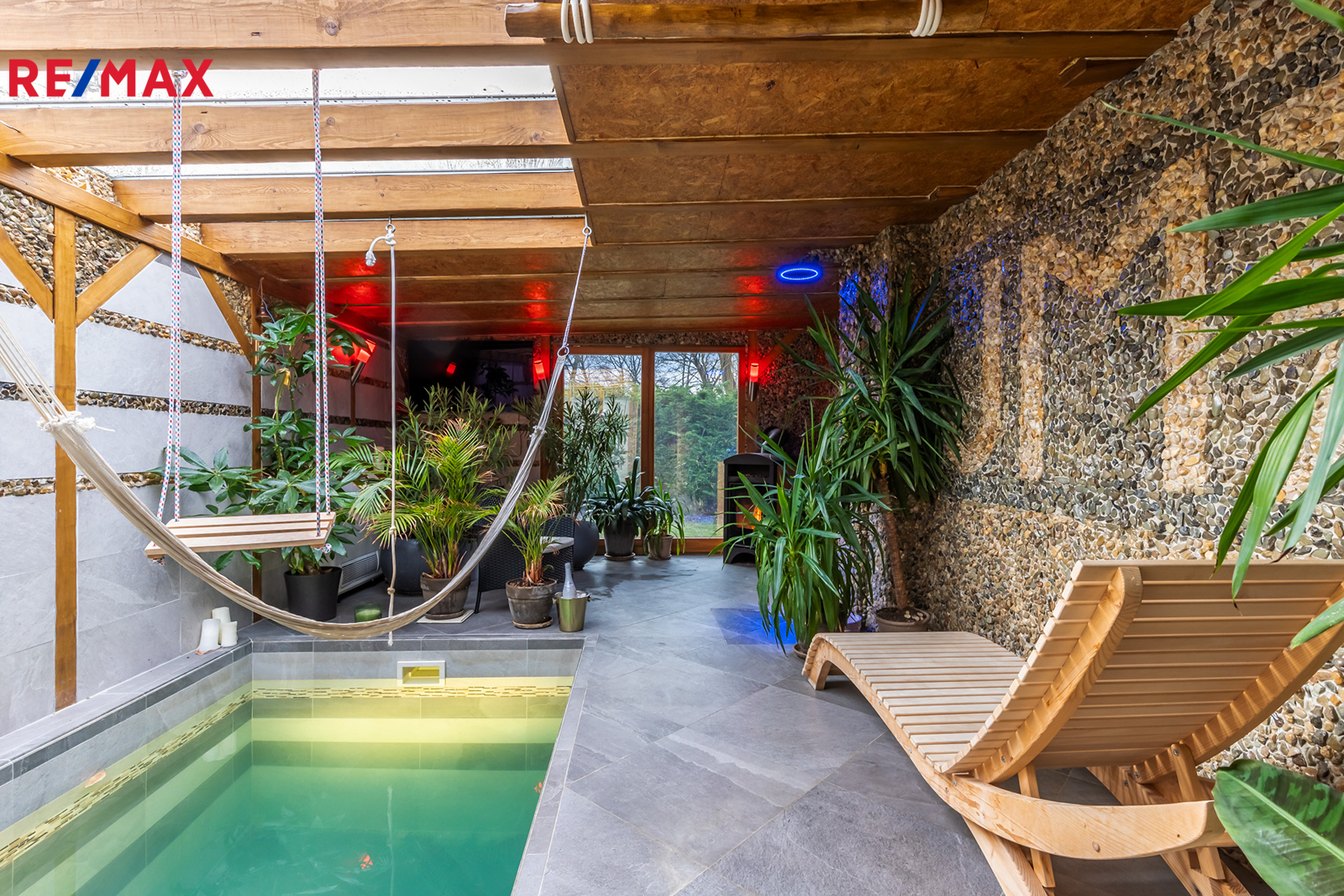Wellness část nabízí krásných 45 m². Nachází se zde bazén se slanou vodou (vyhřívaný) a na míru dělaná sauna. Nechybí ani otevřená sprcha a krbová kamna.