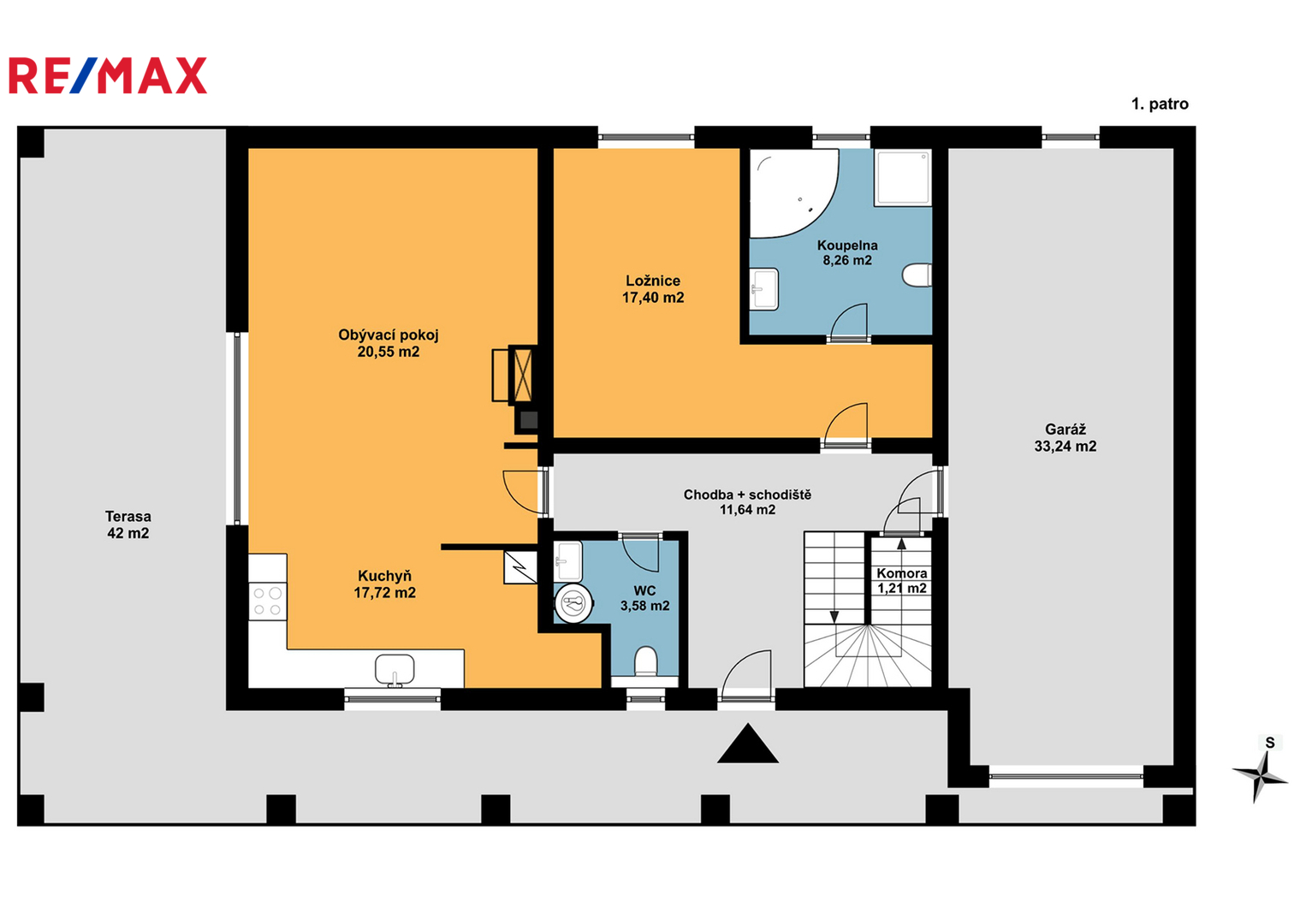 1. patro čítá plochu 155,6 m² kde vás uvítá reprezentativní vstupní hala. Po celé ploše spodního patra je položena italská dlažba 60x60 ve které je aplikováno podlahové topení. Z hlavního vstupu či vstupu z obývací prostoru vás uvítá rozlehlá terasa o výměře 42 m². V daném patře se nachází koupelna s rohovou vanou vč. toalety a toaletou pro hosty.