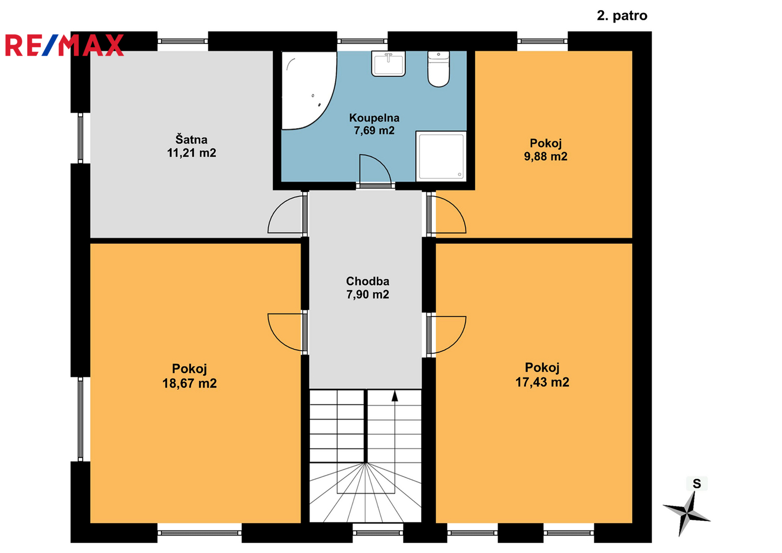 2. patro čítá plochu 72,78 m² nachází se zde 3 obývací místnosti + koupelna se sprchovým koutem a vanou. Po celé ploše horního patra je položena dřevěná laminátová podlaha.