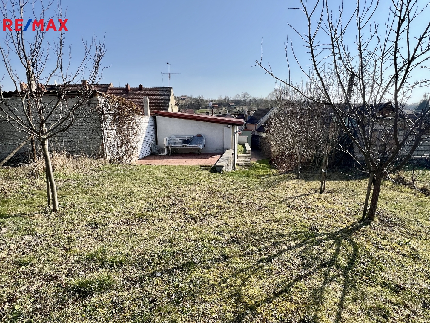 Za domem je malý uzavřený dvorek, zděná kůlna/dílna a mírně svažitá zahrada s ovocnými stromy a keři.
