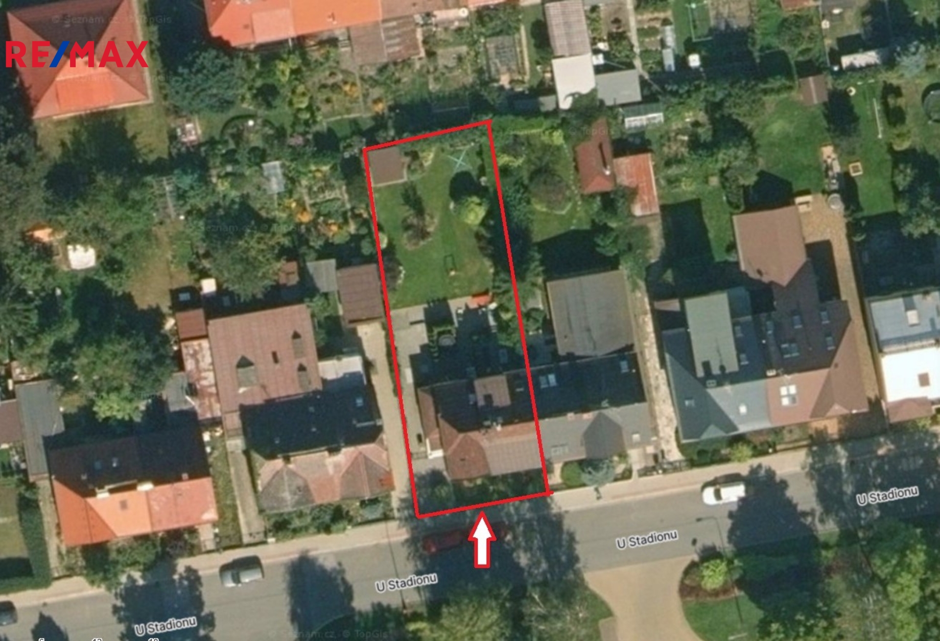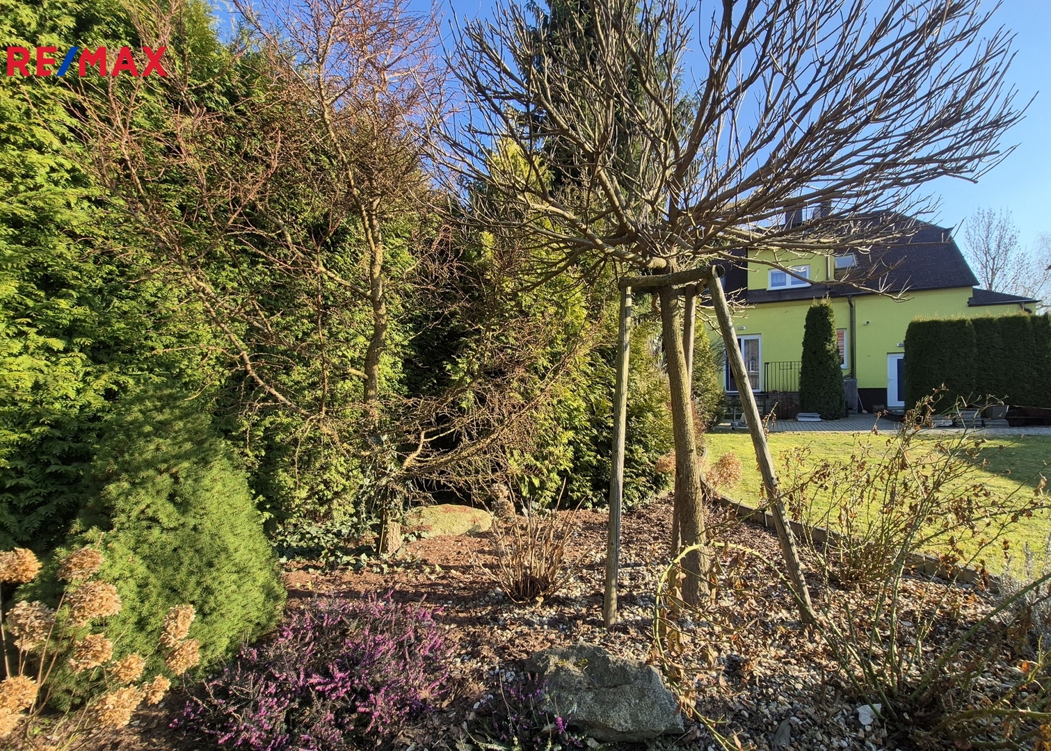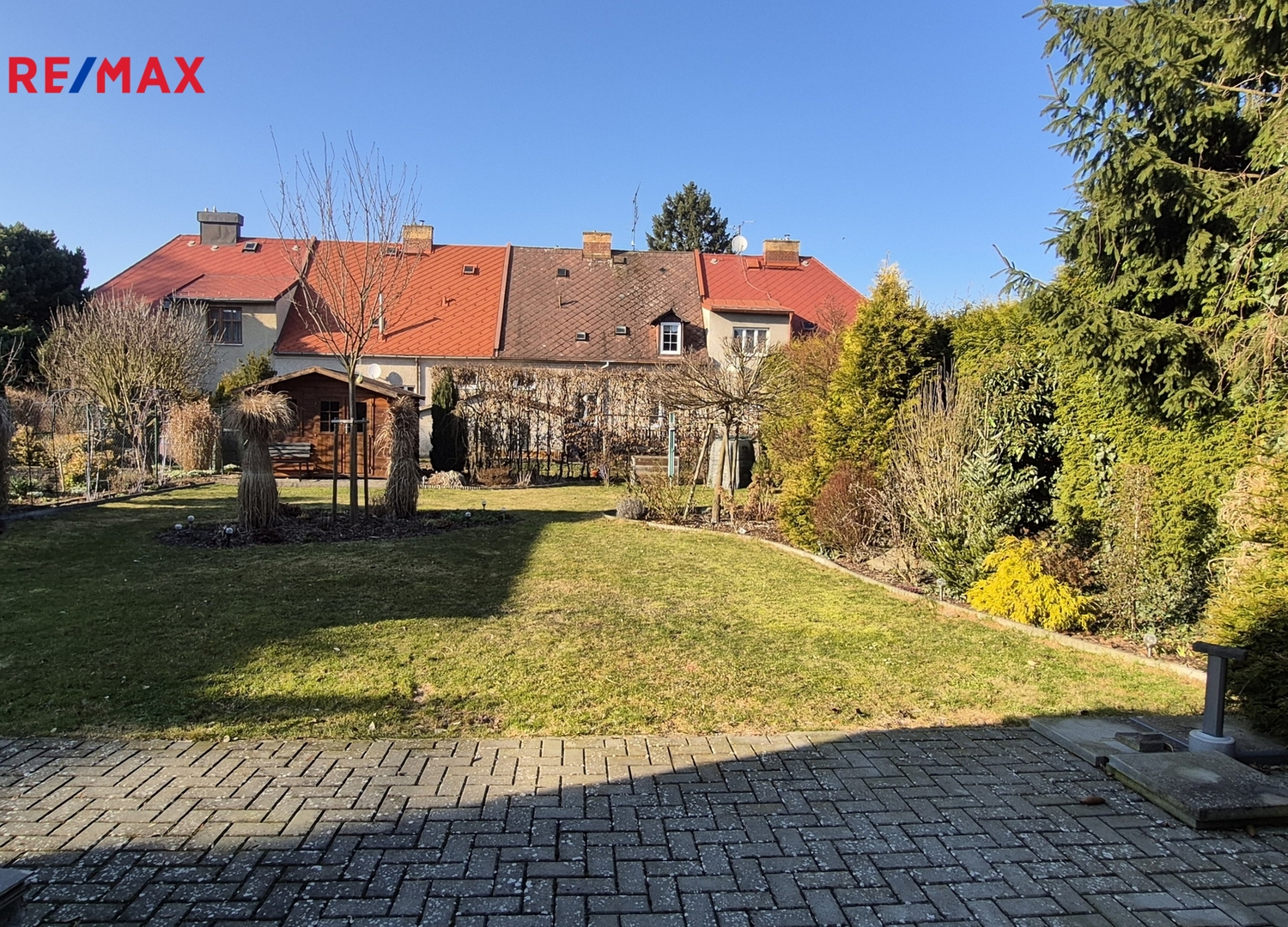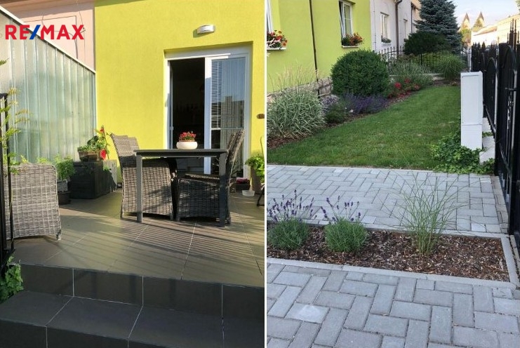 Terasa a část kolem domu je vydlážděná. Před domem je malá okrasná předzahrádka, vzadu za domem zahrada o výměře 284 m2 s dřevěným zahradním domkem, vydlážděná část má výměru 27 m2.
