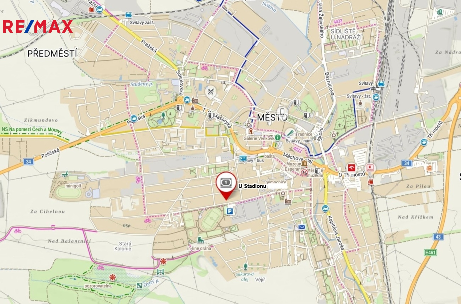 Nemovitost se nachází v pěkné a klidné části obce, v těsné blízkosti Svitavského stadionu, kryté haly Šapito, zimního stadionu, in-line dráhy, tenisového hřiště, dětského hřiště, nedaleko je Park patriotů, Vodárenský les s naučnou stezkou, pošta apod.