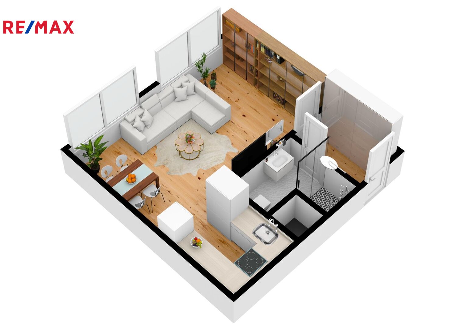 Byt se nachází ve 4. nadzemním podlaží revitalizovaného panelového domu s výtahem. Dispozičně je řešený jako 1+kk.