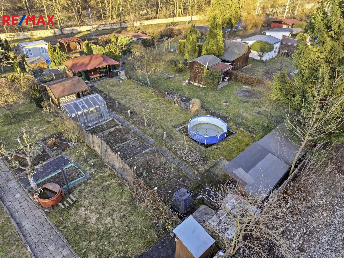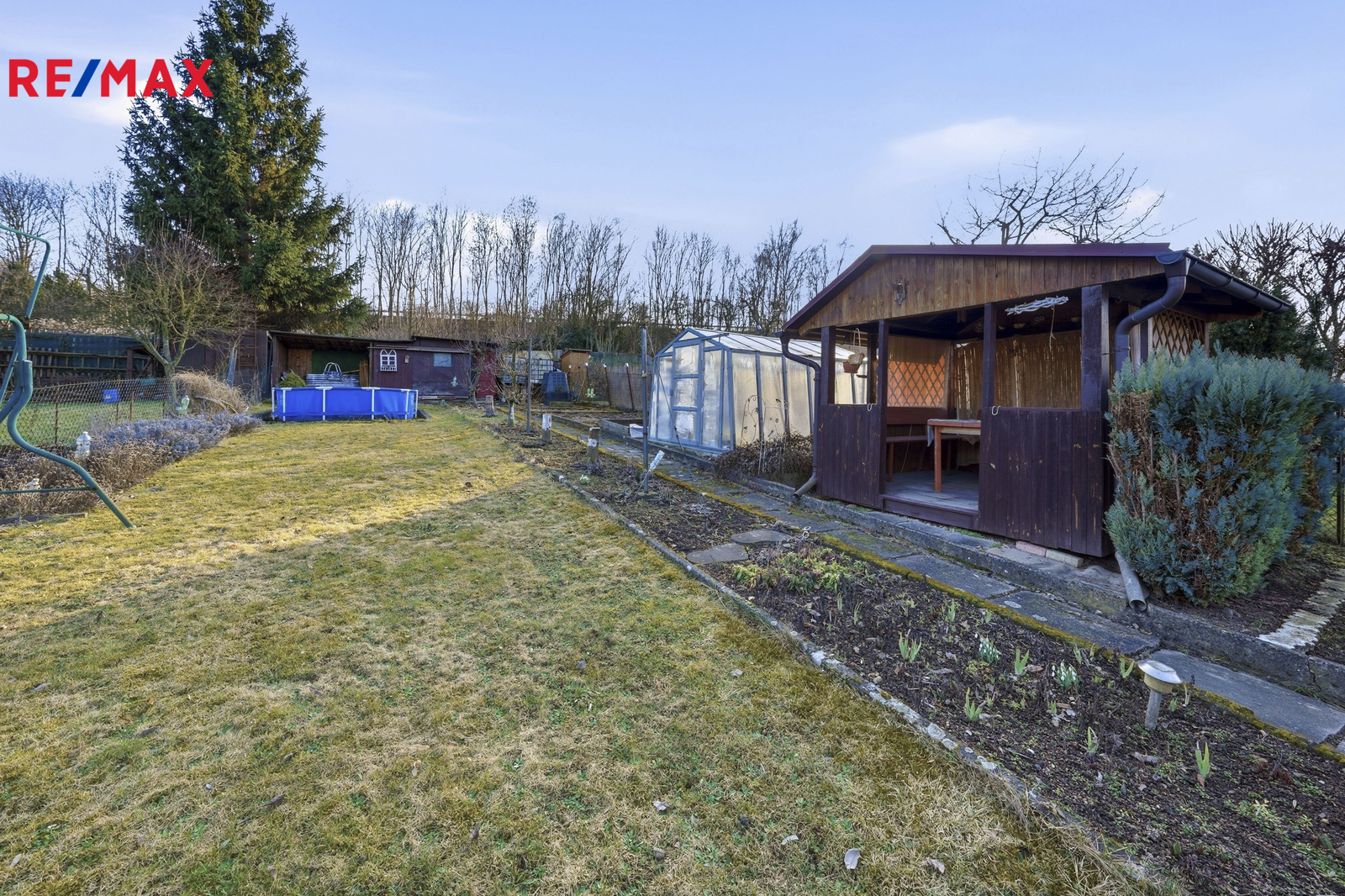 Zahrada je ideálním místem pro trávení volného času. Najdete zde bazén pro letní osvěžení, altán s krbem, kde si můžete užívat grilování a příjemné chvíle s rodinou či přáteli, skleník pro pěstování vlastní zeleniny, kompostér a také kůlny v horní části zahrady. K dispozici je rovněž chemické WC.