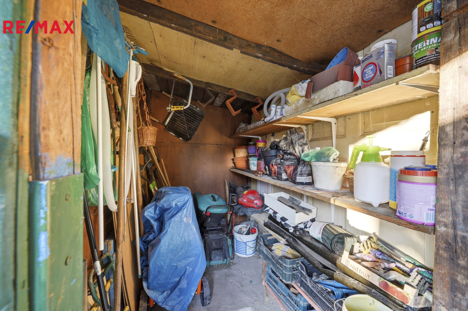 Na pozemku se nachází útulná dřevěná chata, která poskytuje zázemí pro víkendový odpočinek i uskladnění věcí. Součástí chaty je praktická technická místnost pro zahradní nářadí a vybavení, která e zároveň i podsklepená.