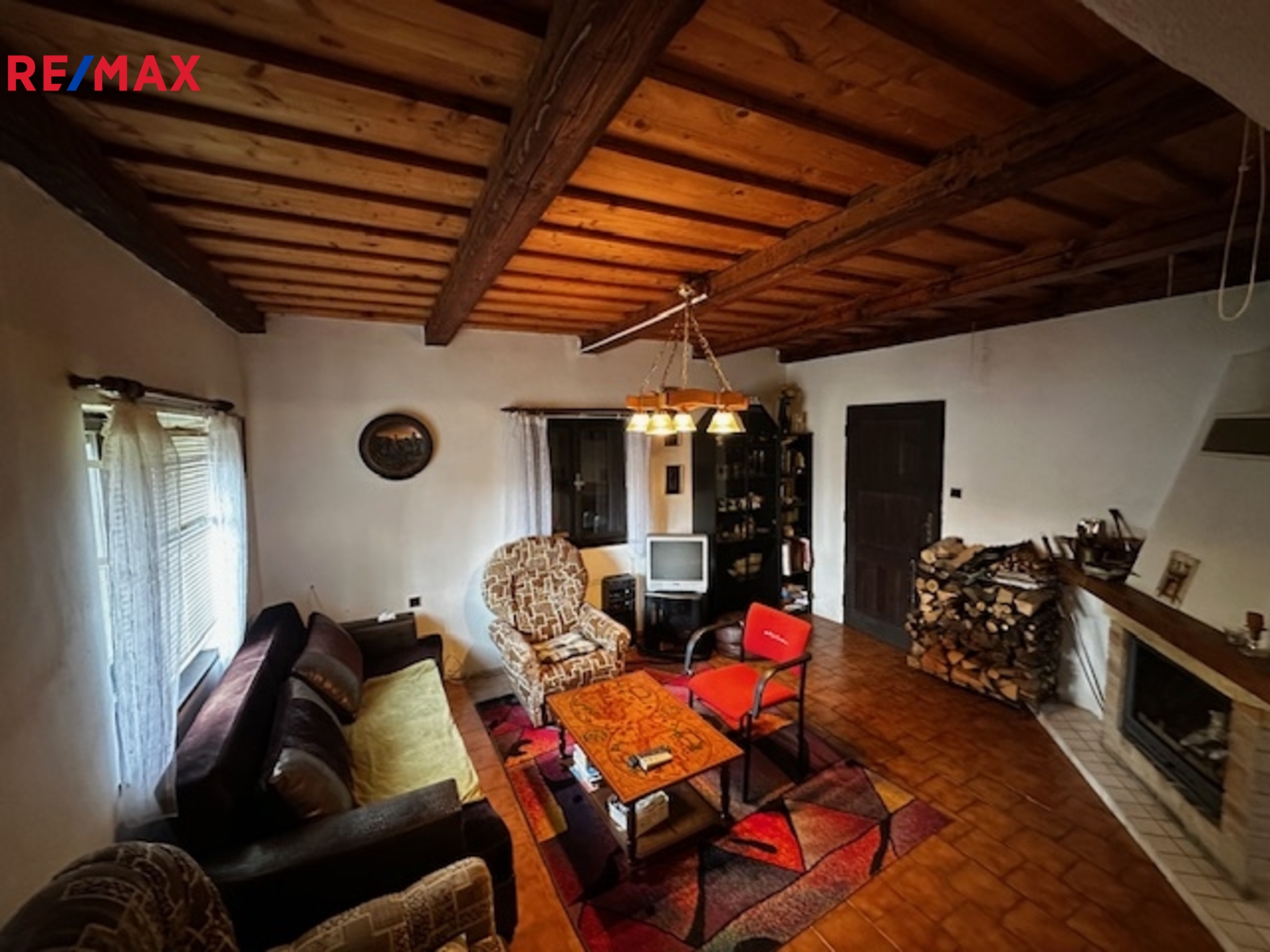 • útulný interiér s krbem na tuhá paliva