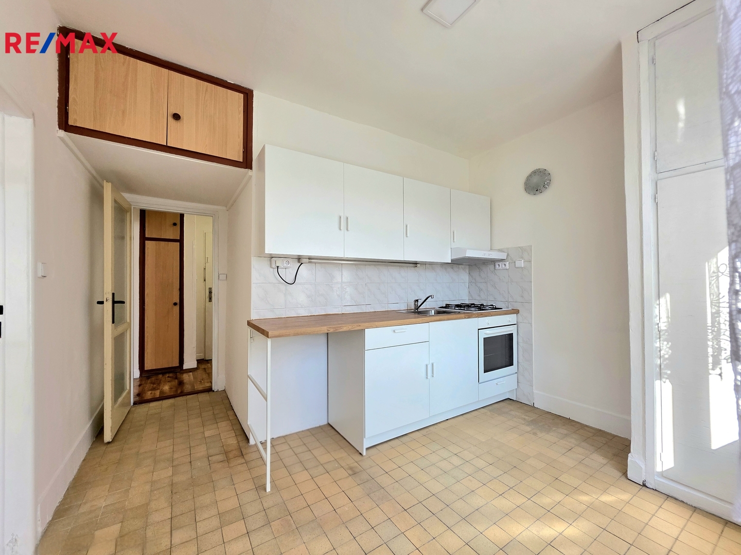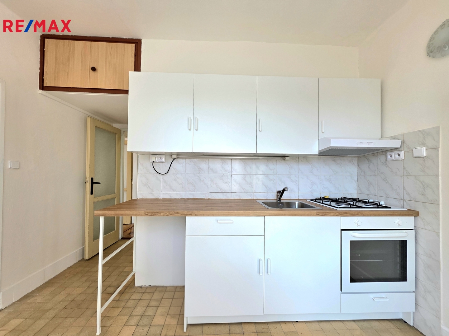 • Kuchyně: Světlá kuchyňská linka s dostatkem pracovního prostoru. Je vybavena plynovým sporákem, elektrickou troubou a digestoří. Pod linkou je připravené místo na pračku. Výhodou jsou chytře řešené vestavěné úložné prostory pod stropem.