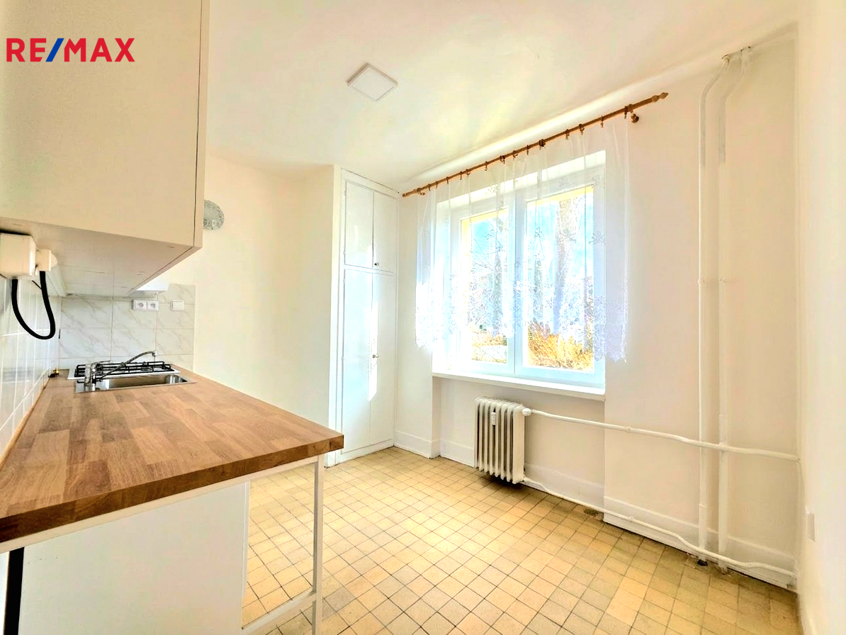 • Pokoje: Byt nabízí dva neprůchozí pokoje. V jednom z pokojů se nachází krásné, zachovalé, renovované dřevěné parkety, které dodávají interiéru teplo a styl. V druhém pokoji je přes ně položeno linoleum. Oba pokoje jsou nově vymalované, mají velká okna, která poskytují dostatek světla a nabízejí výhled do zeleně.