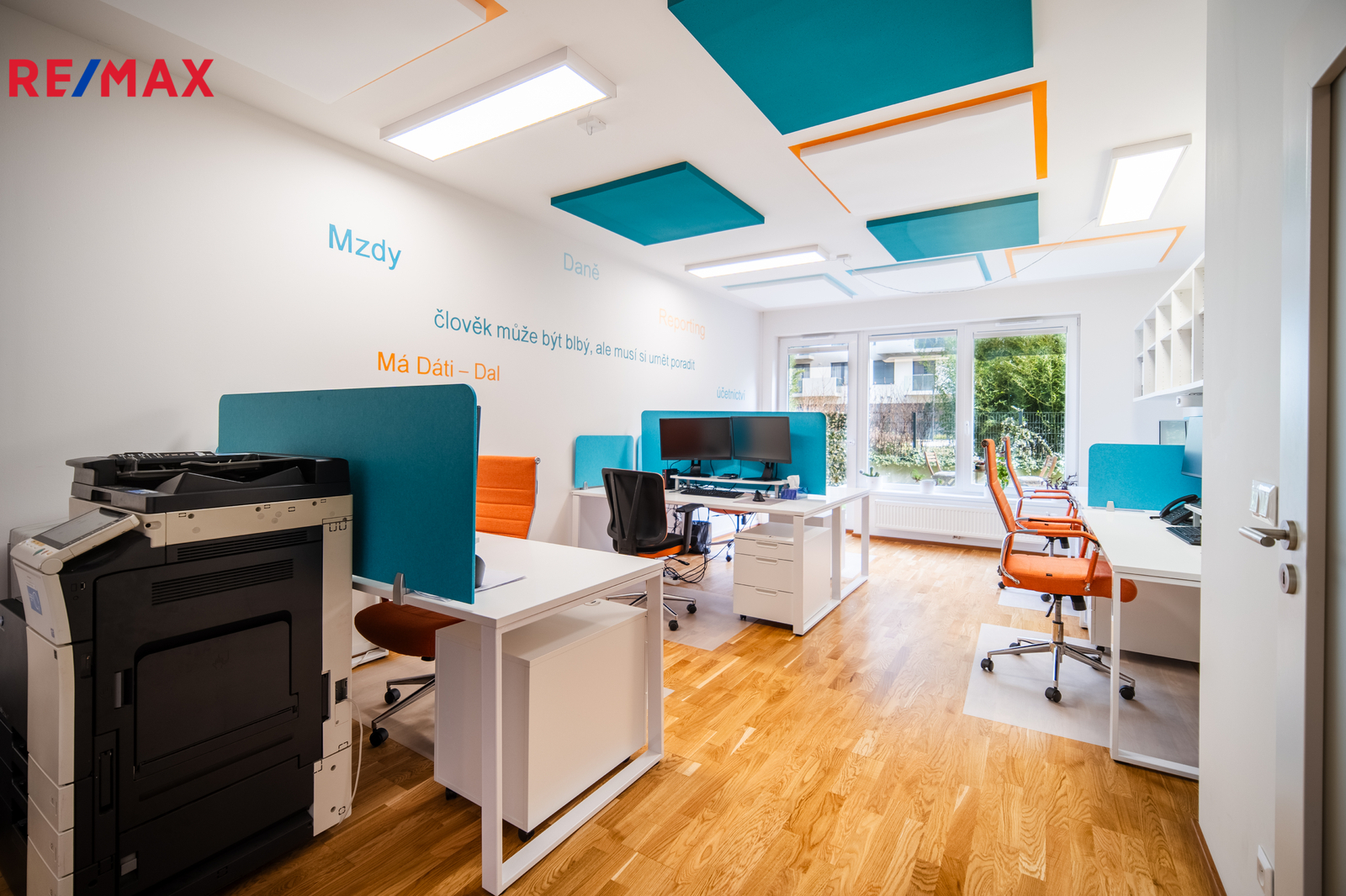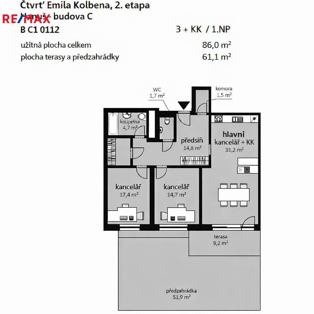 - hlavní kancelář / open space (31,2 m²) se vstupem na terasu (9,2 m²) a předzahrádku (51,9 m²)