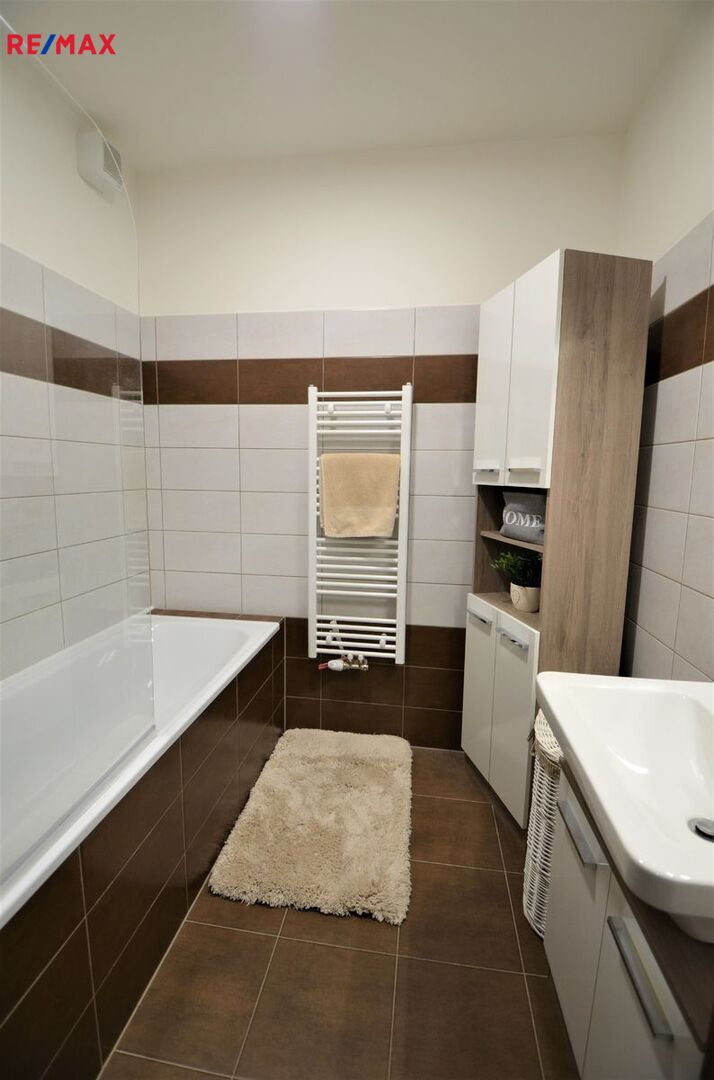 Podlahy v obytných místnostech jsou vinylové, v koupelně a na WC keramická dlažba. Vytápění i ohřev vody jsou řešeny dálkově, v domě není zaveden plyn. Byt se pronajímá bez nábytku, zůstávají pouze vestavné skříně v ložnici a předsíni.