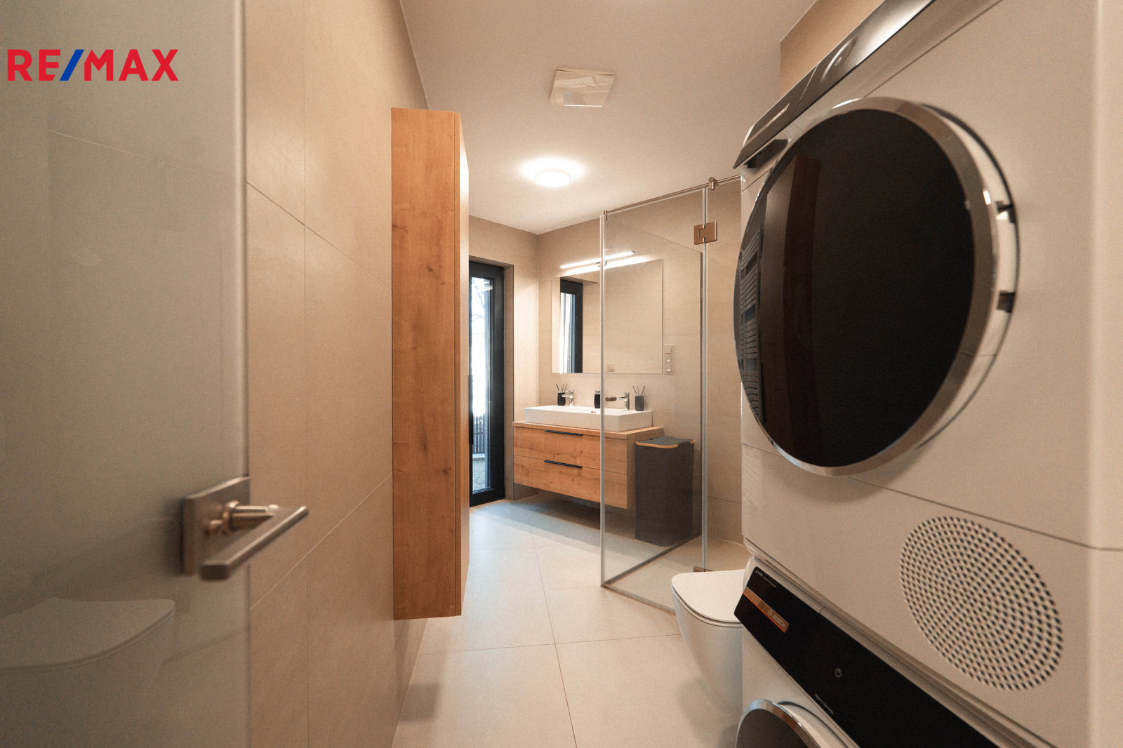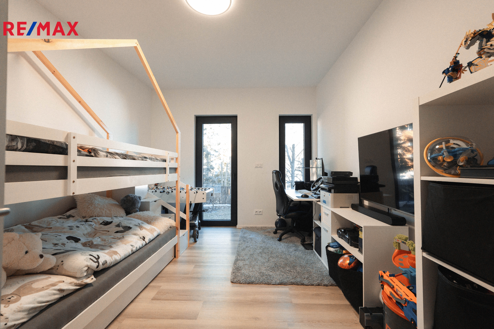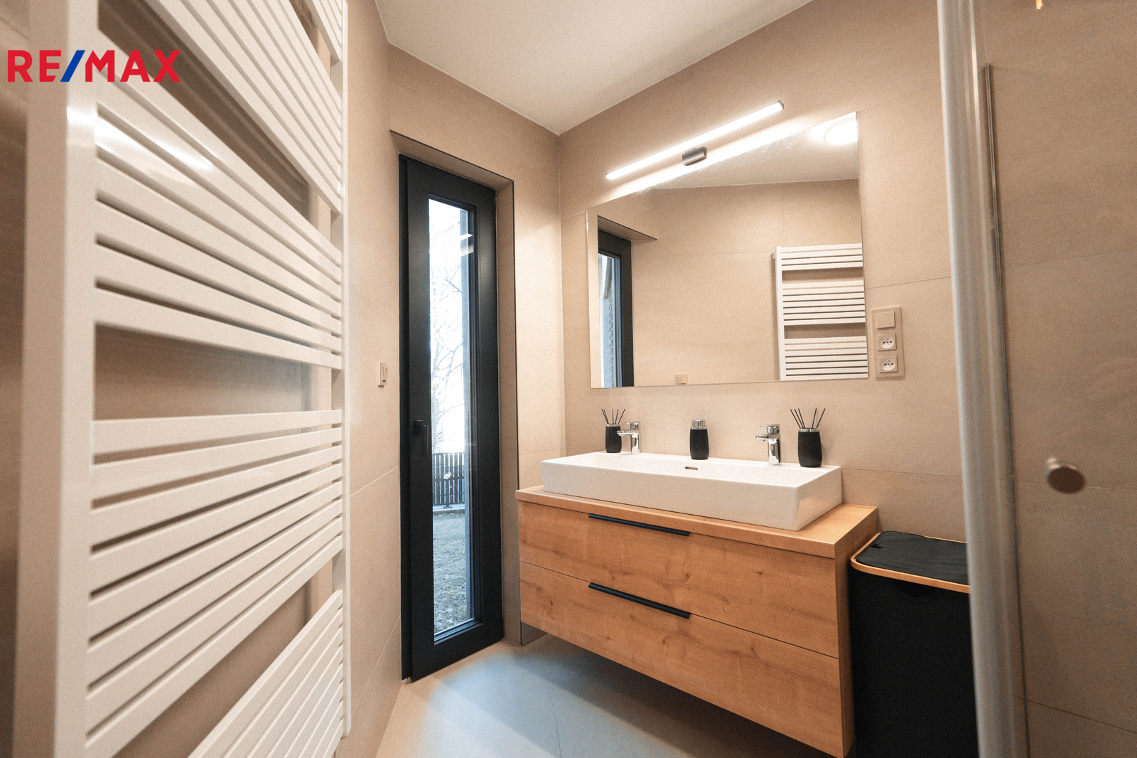 Komfort a technologie: Okna jsou opatřena venkovními žaluziemi, které zajišťují perfektní termoregulaci a soukromí. O teplo se stará úsporné tepelné čerpadlo v kombinaci s podlahovým vytápěním.