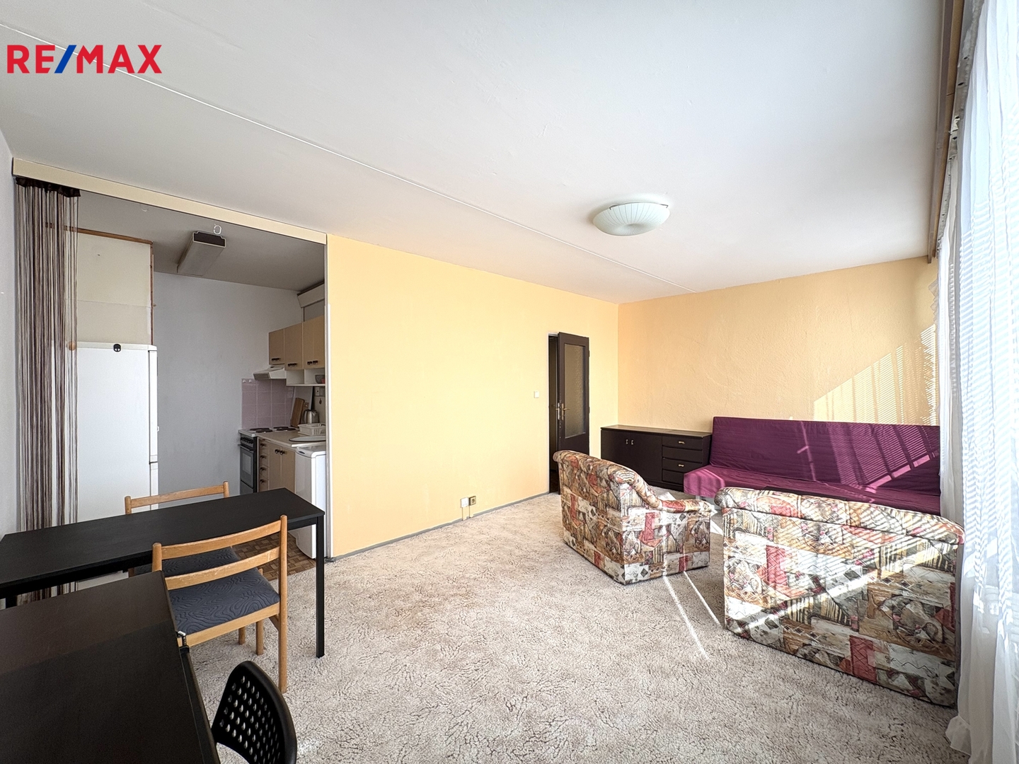 Interiér bytu je tvořen vstupní předsíní s vestavěnou skříní, dále pak prostorným pokojem se vstupem do odděleného kuchyňského koutu, koupelnou se sprchovým koutem a samostatným WC (původní umakartové jádro).