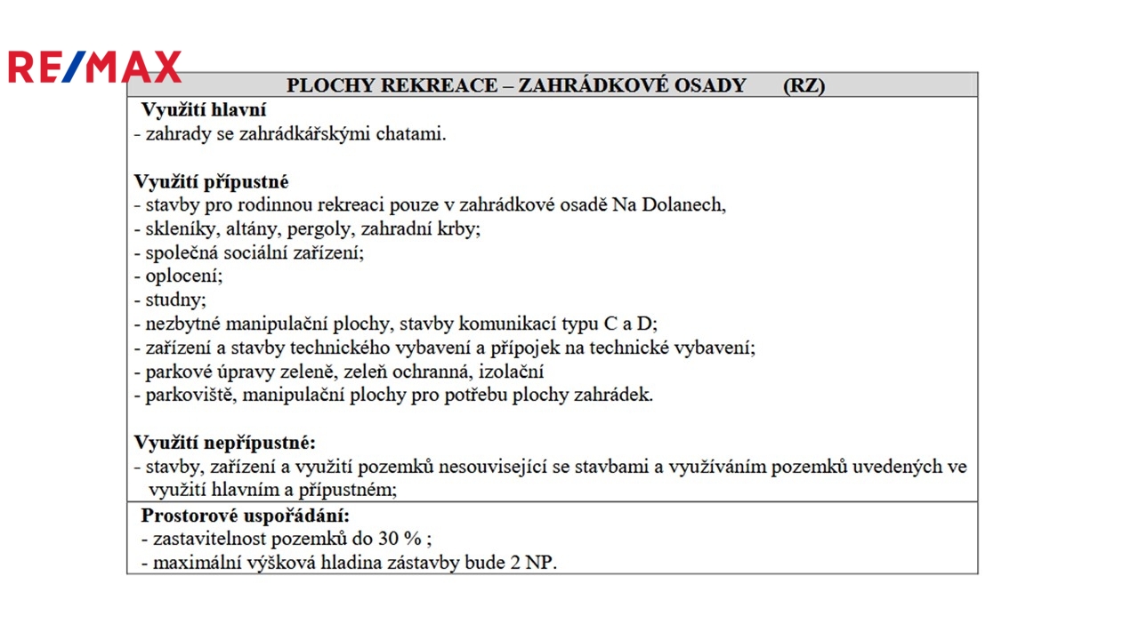 Pozemek je svažitý, s jiho-západní orientací, je na něm umístěna původní kopaná studna a plechová mobilní garáž, dříve započala výstavba plotu (vyzdění sloupků). Na pozemku je možnost umístění zahradní chatky či drobné rekreační stavby (dle platného územního plánu, pozemky kat. RZ - rekreace, zahradní osady).