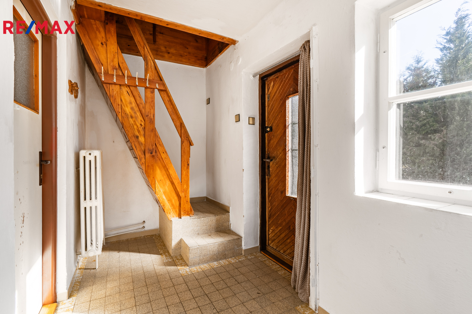 Do chaty vstoupíte přes prostornou terasu o velikosti 17 m². Následně se dostanete do předsíně, odkud vede vstup do světlé kuchyně propojené s obývacím pokojem (13,4 m²) s krásným výhledem do zahrady.