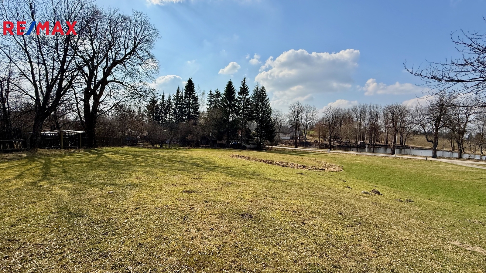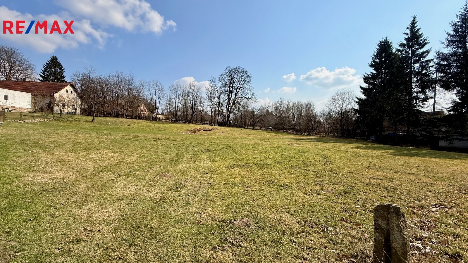Elektřina je přivedena do elektrického sloupku na okraji pozemku.