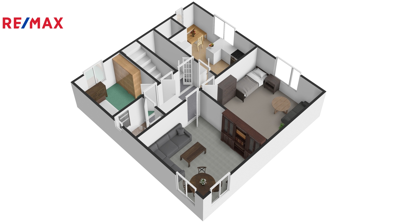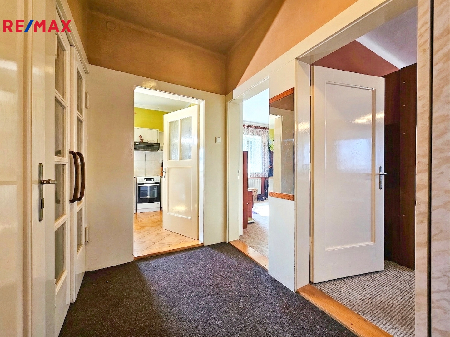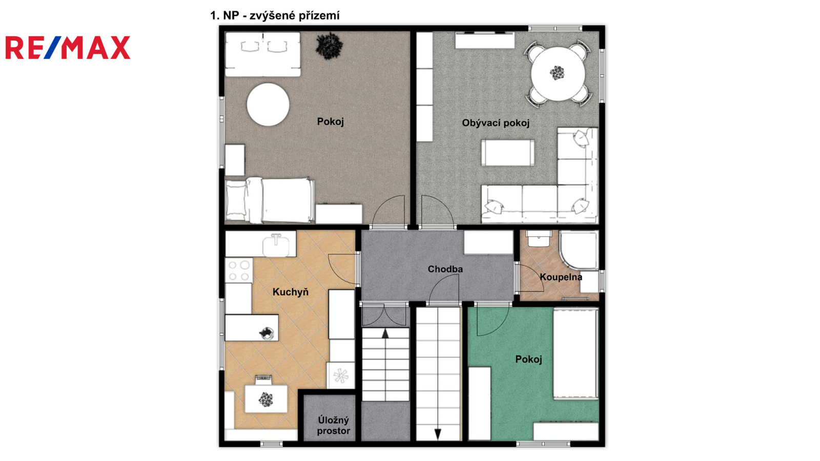 Ve zvýšeném přízemí se nachází tři samostatné pokoje, kuchyně, koupelna se sprchovým koutem a chodba.