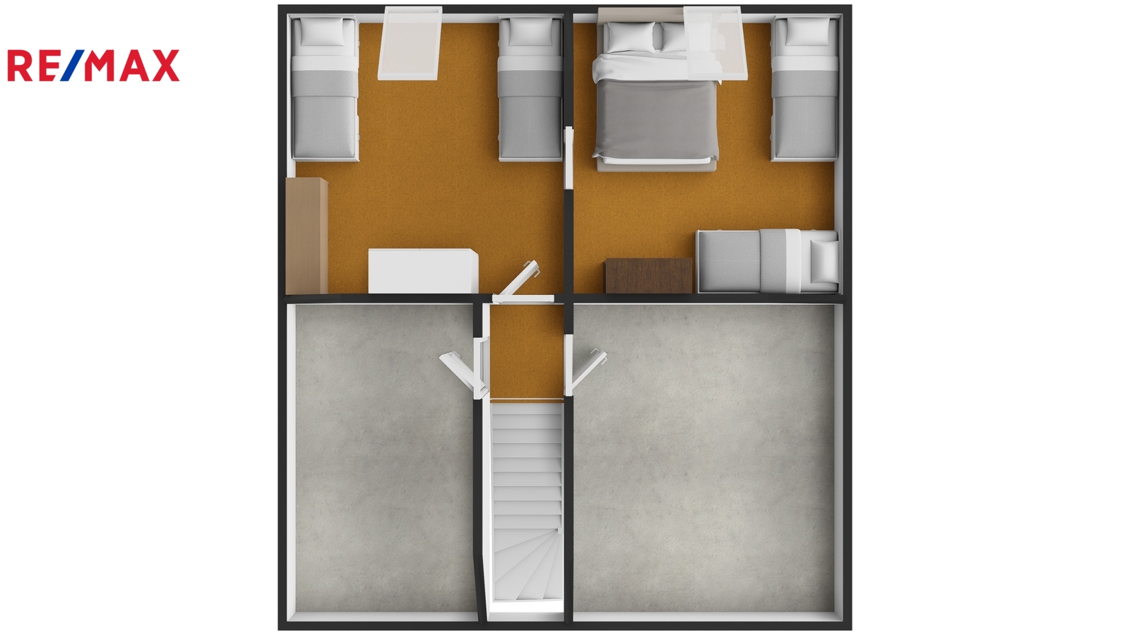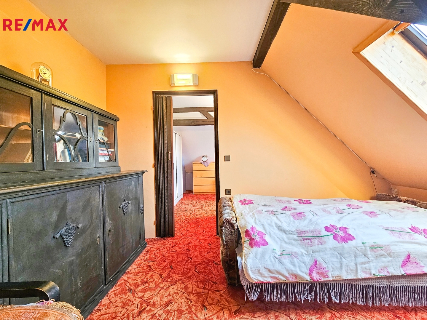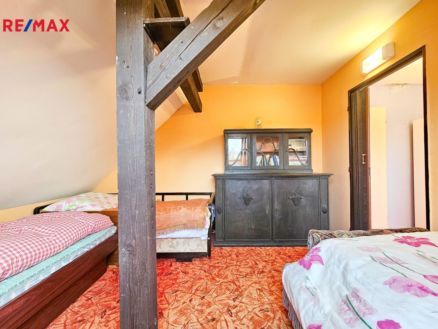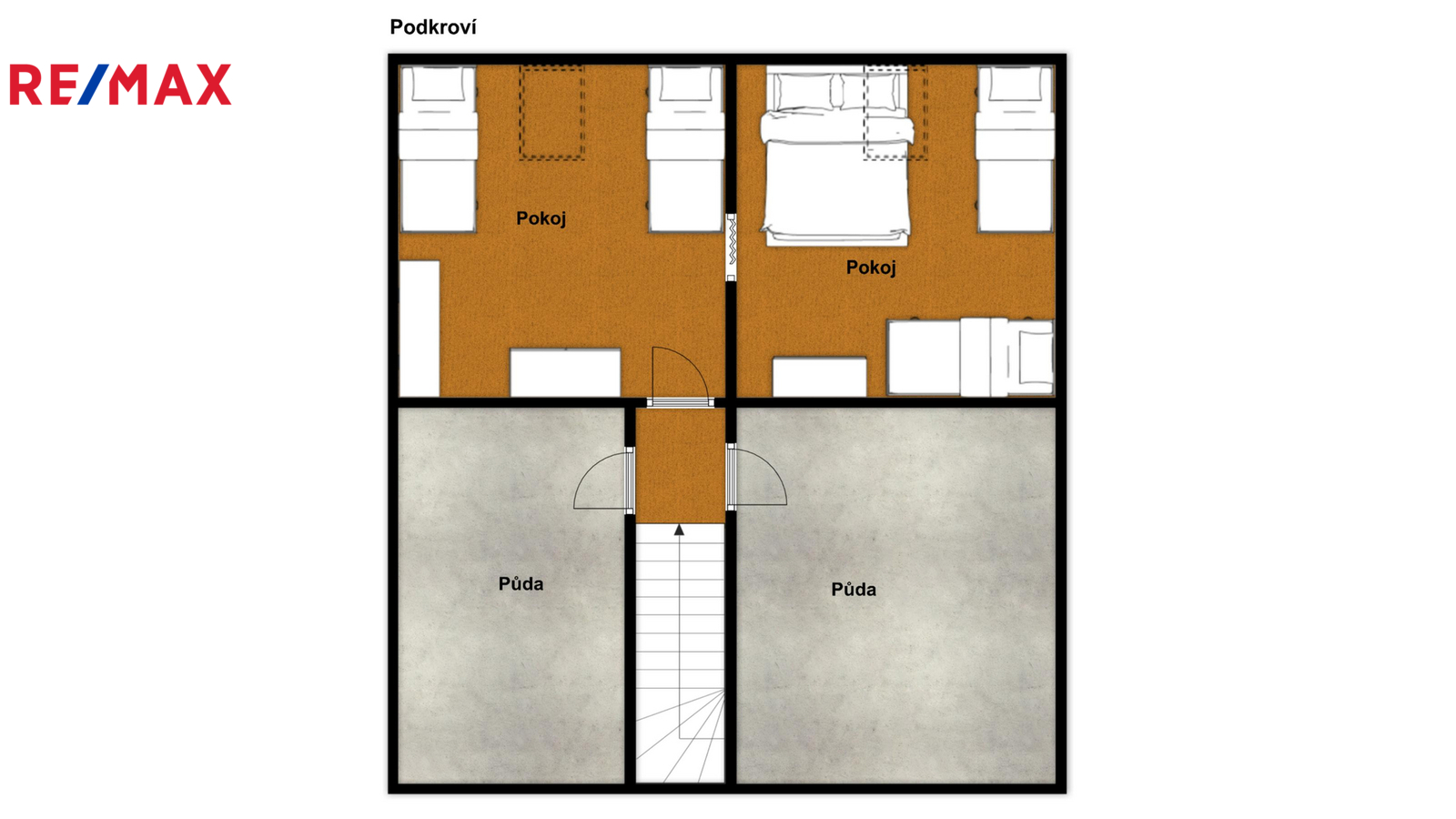 Podkroví je tvořeno dvěma pokoji, malou chodbou a dvěma půdními prostory vhodnými pro uskladnění věcí, případně s možností přestavby na další dva malé pokoje.