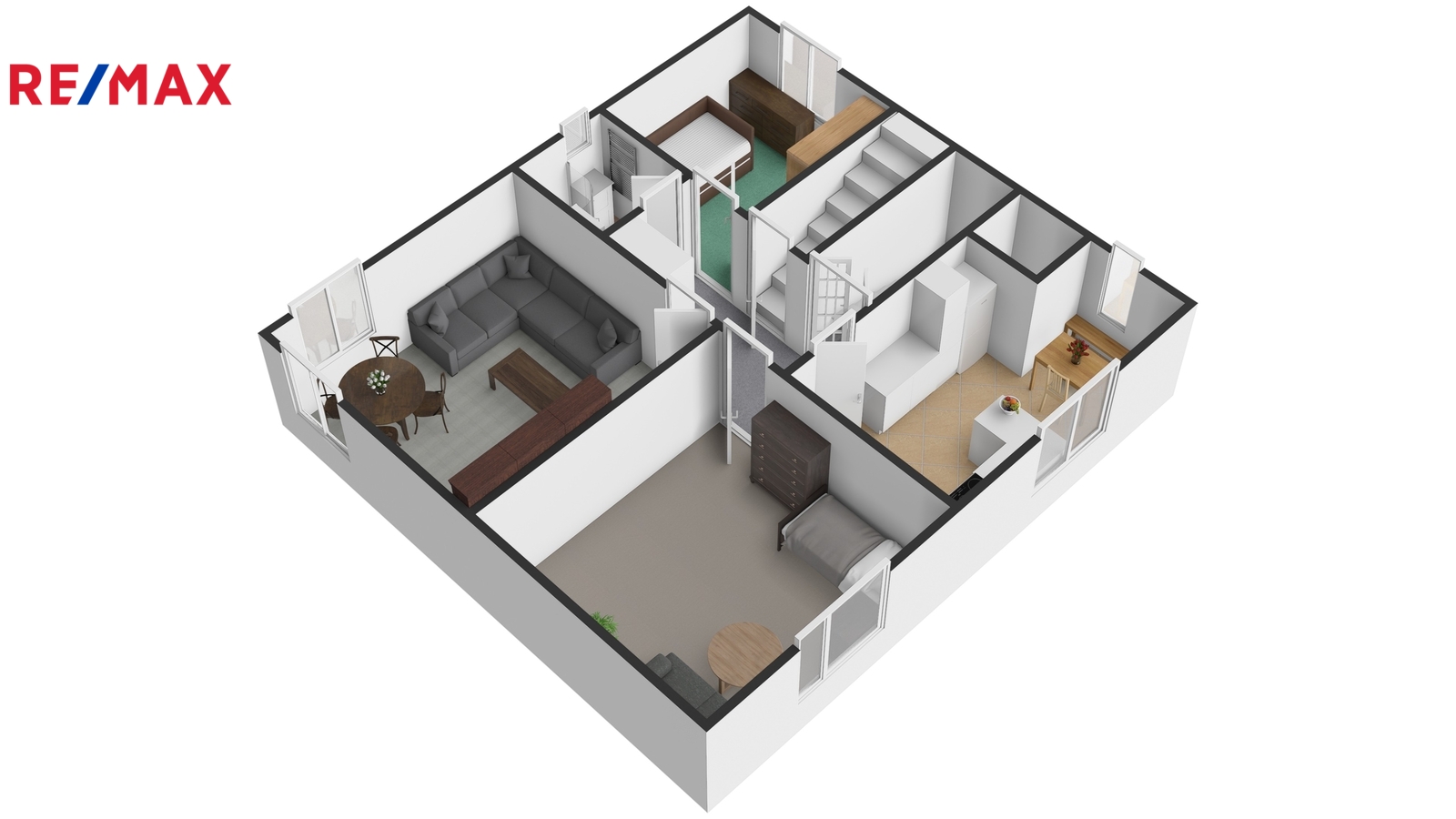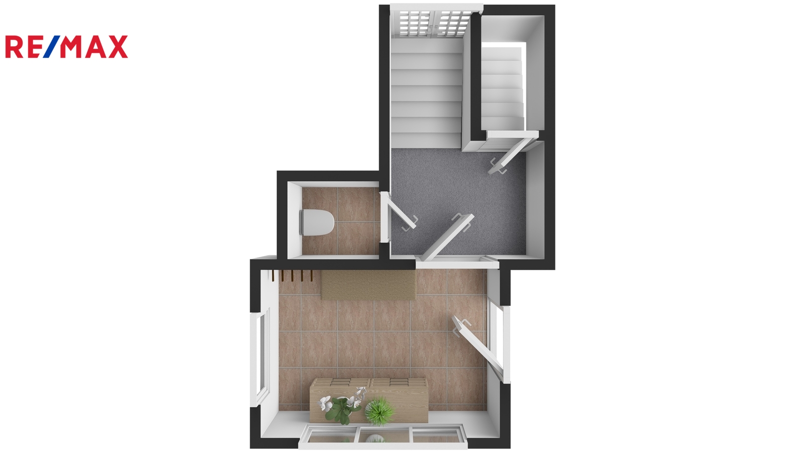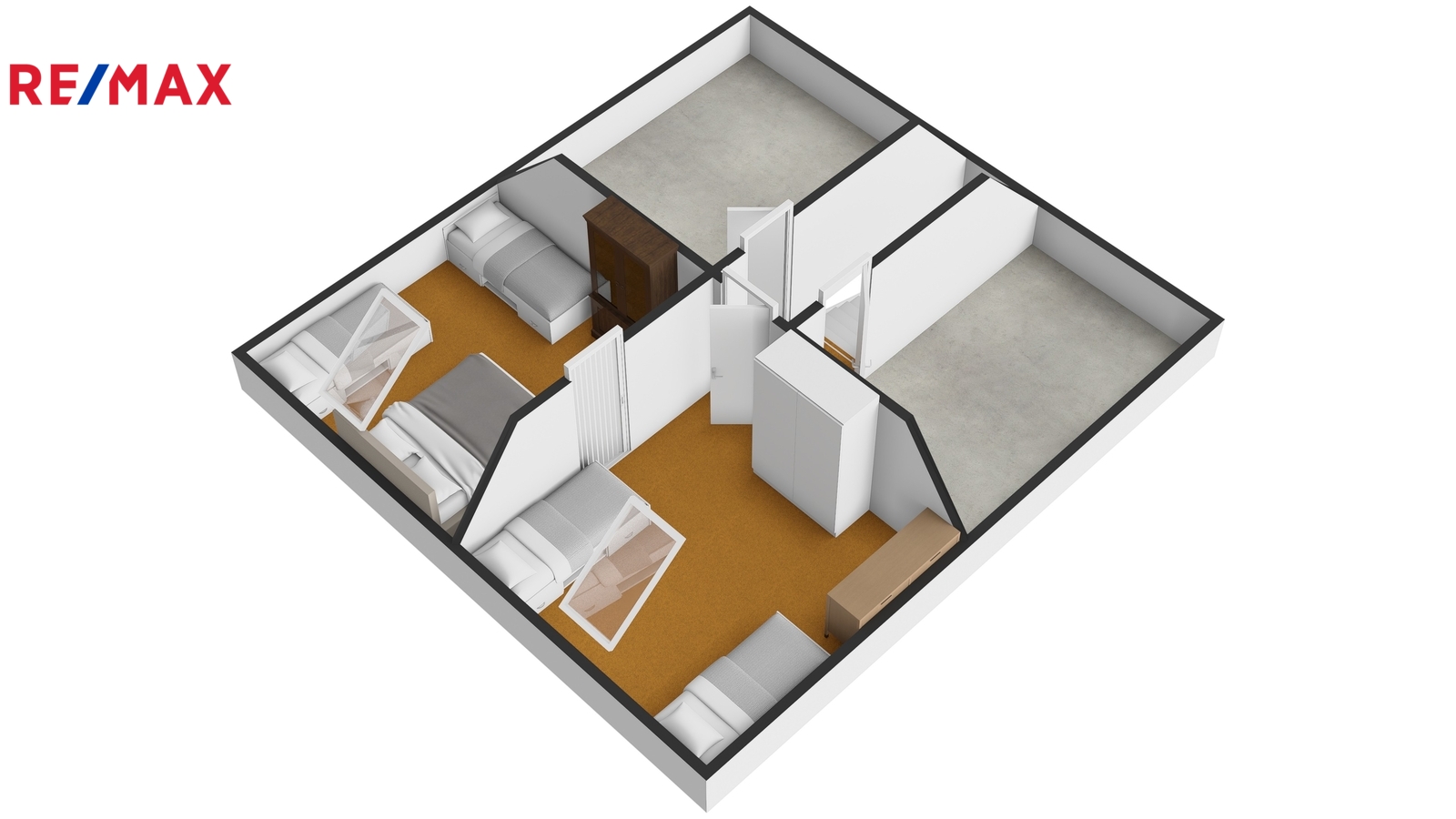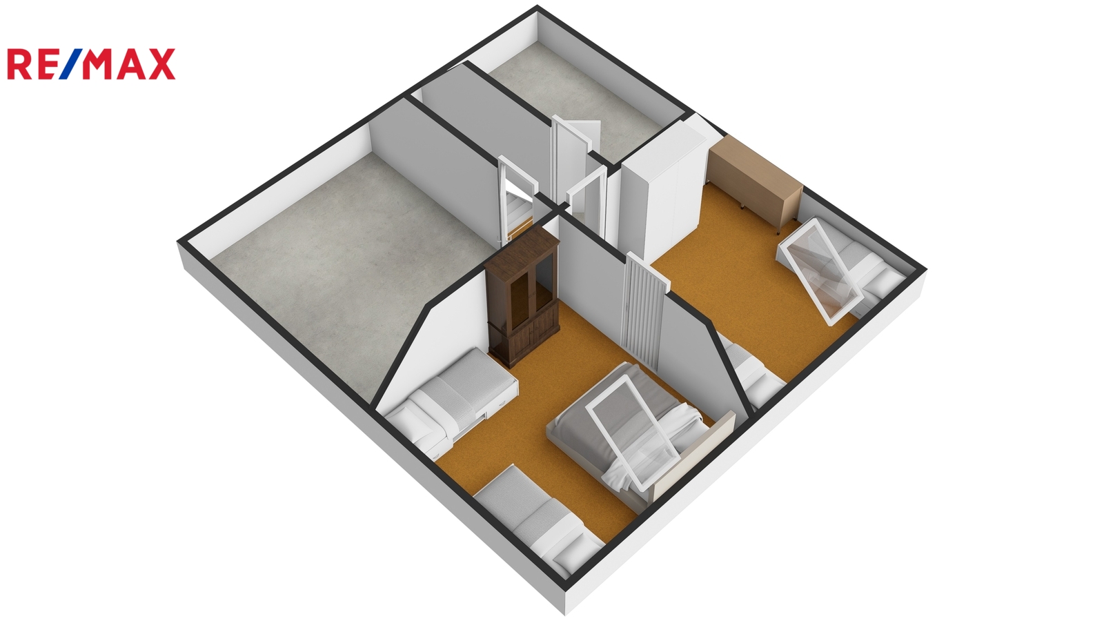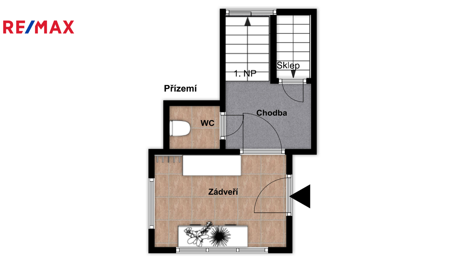 Podkroví je tvořeno dvěma pokoji, malou chodbou a dvěma půdními prostory vhodnými pro uskladnění věcí, případně s možností přestavby na další dva malé pokoje.