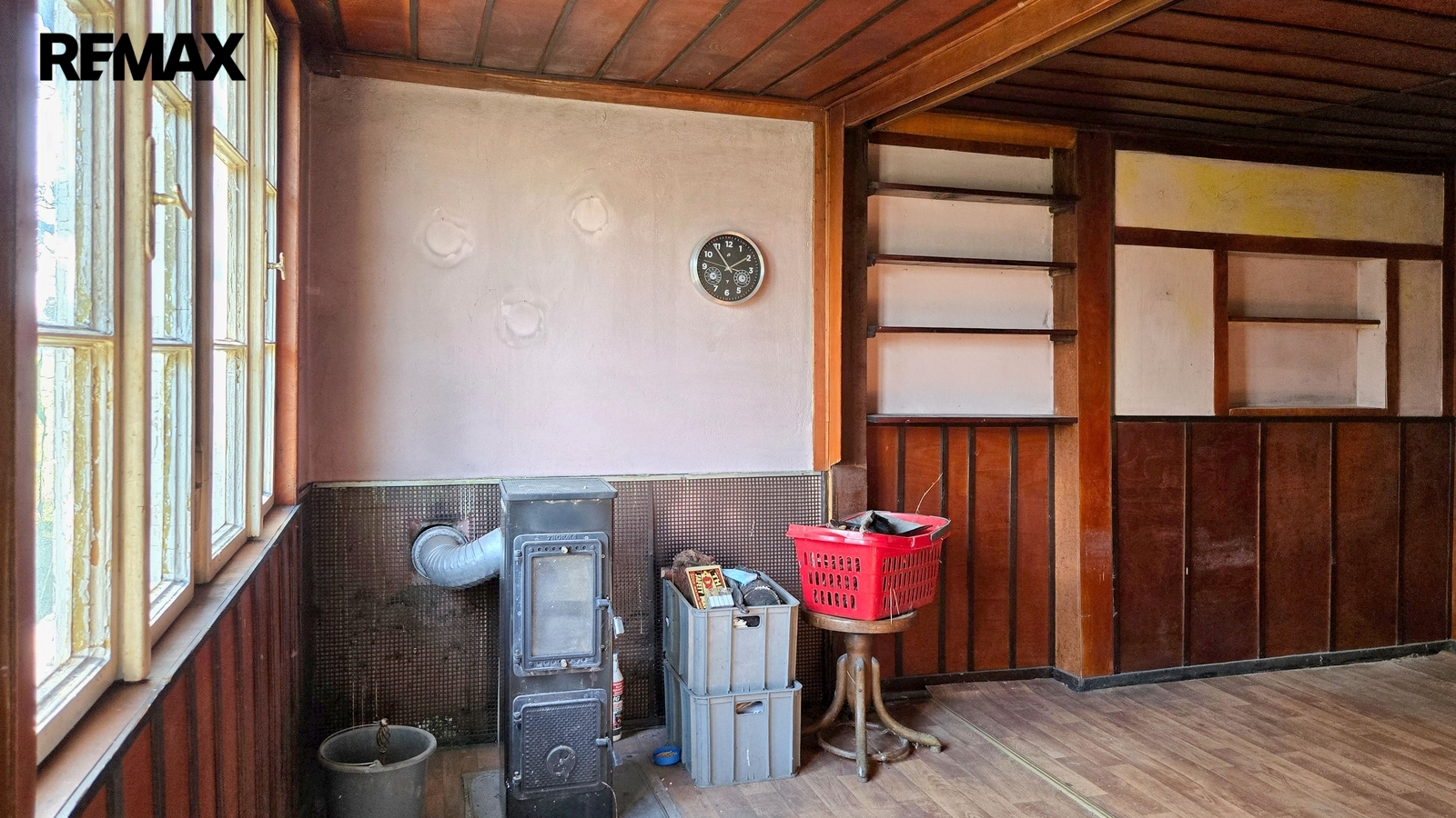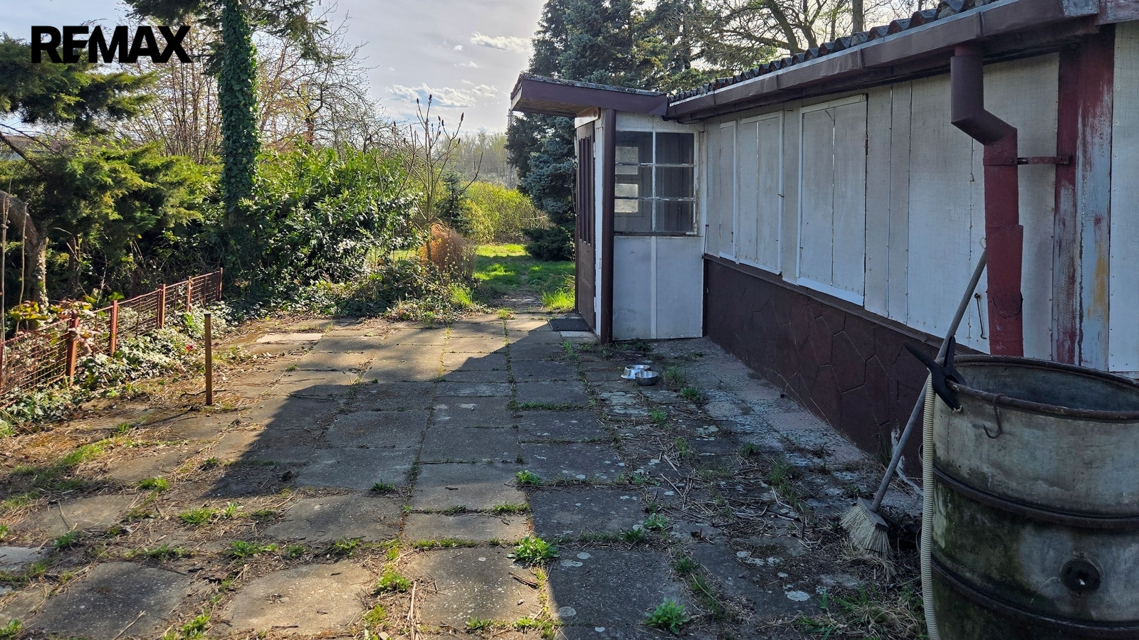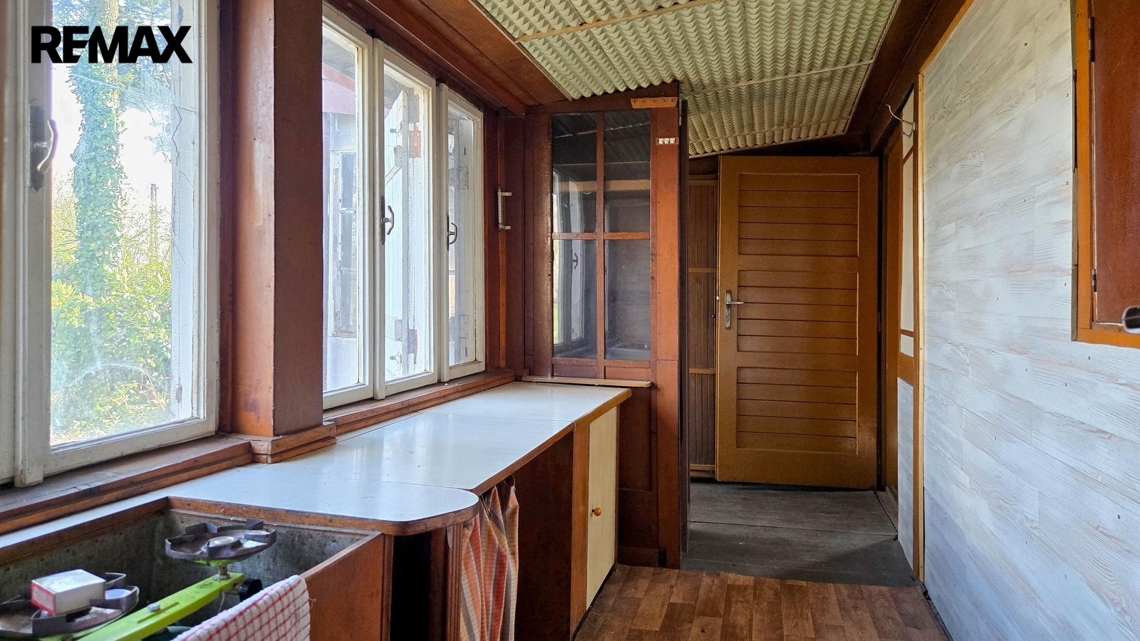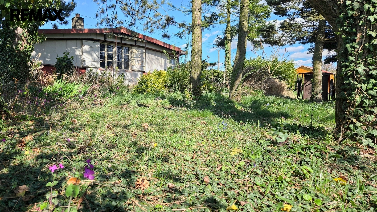 Na zahradě je umístěna chatka o ploše cca 30 m2. V chatce je jedna místnost cca 10 m2, menší kuchyňka s plynovým vařičem, komora, dílna, sklad.