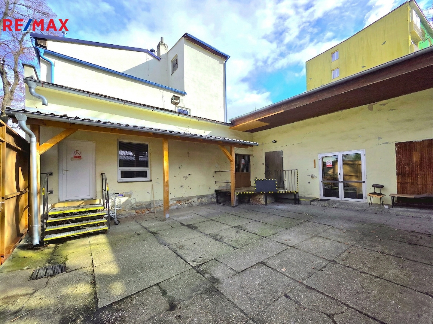 Mezi přízemím a 1. nadzemním podlažím je k dispozici nákladní výtah a schodiště, což usnadňuje logistiku a přesun materiálu mezi podlažími. K objektu náleží také menší uzamykatelný dvůr, který může sloužit jako parkovací plocha, manipulační prostor nebo bezpečné zázemí pro zásobování.
