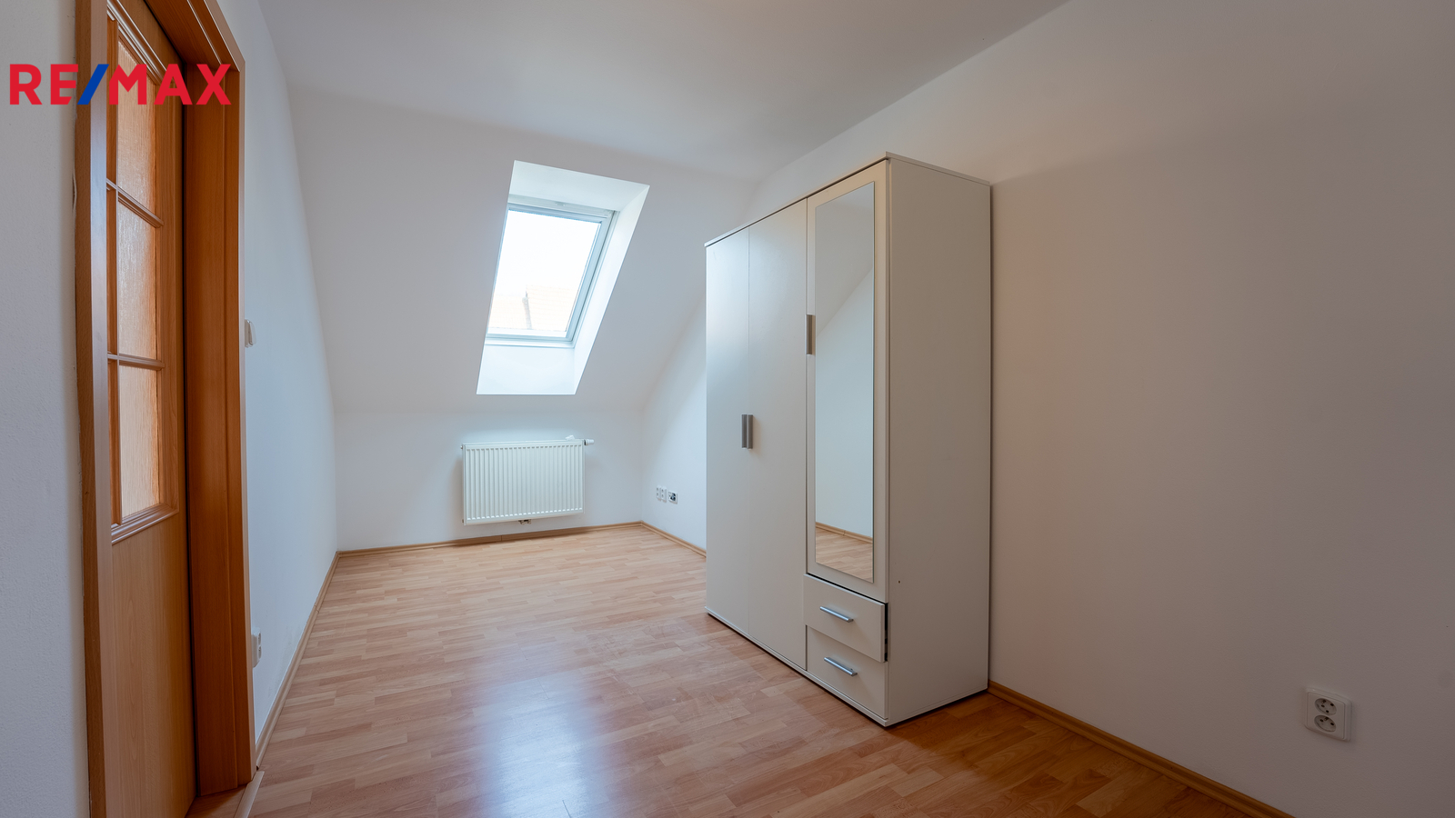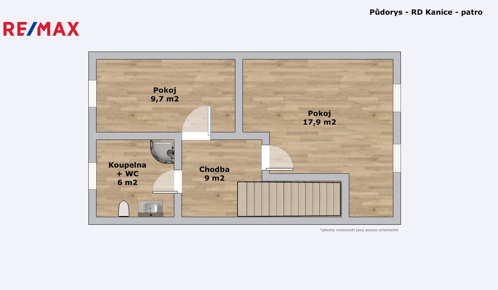 V patře vás přivítá chodba, ze které jsou přístupné dva samostatné pokoje (9,7 m² a 17,9 m²) a koupelna se sprchovým koutem a toaletou.